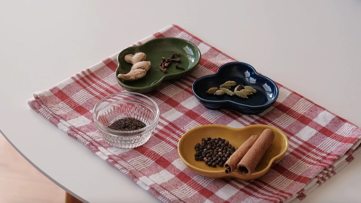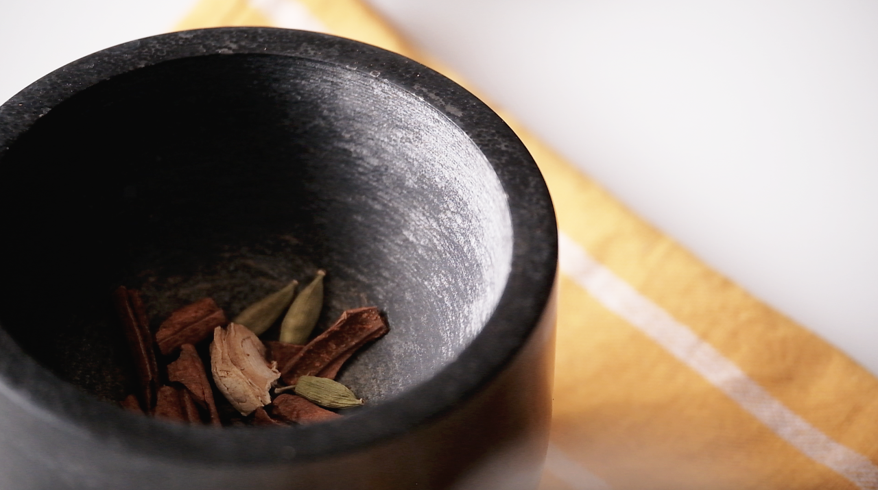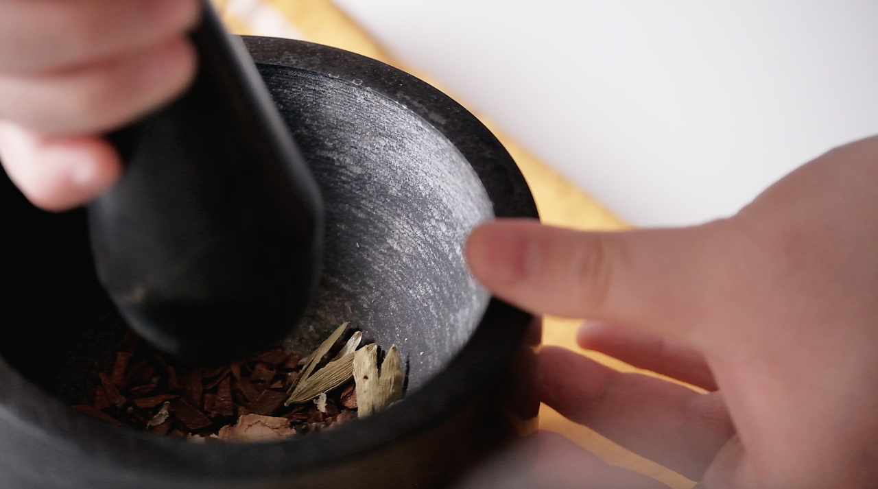 절구나 블렌더를 이용해 향신료(계피스틱 1, 카다멈 3알, 말린생강 한 톨, 흑후추 6알, 정향 2)를 빻거나 갈아줍니다.