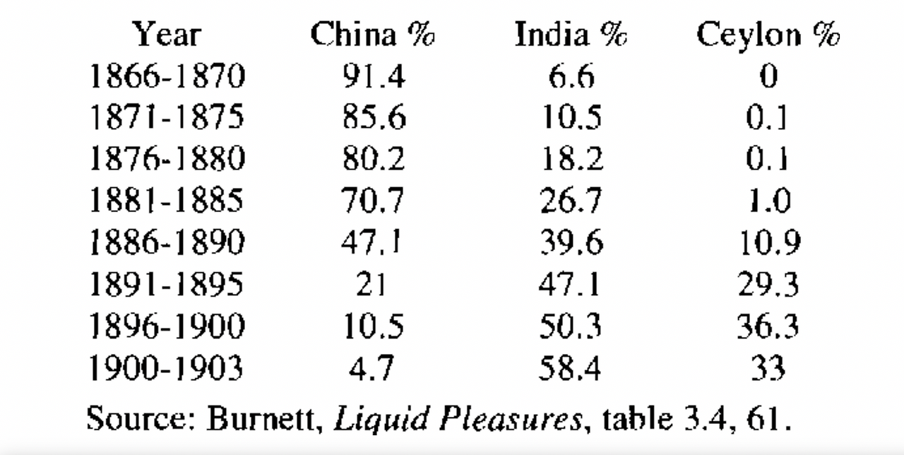 1862년 570톤에 불과했던 아삼 생산량은 약 30년 후인 1890년경에는 4만 톤까지 이르러(인도 전체 생산량이지만 아삼이 대부분을 차지했다) 드디어 영국이 중국에서 수입하는 물량을 초과하기 시작했다. 또다시 10년이 지난 1900년경에는 인도 생산량이 10만 톤에 이르면서, 영국이 중국으로부터 홍차 수입에 의존하지 않게 된다.