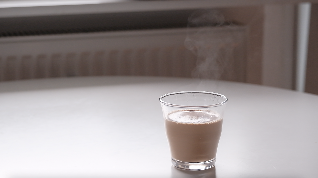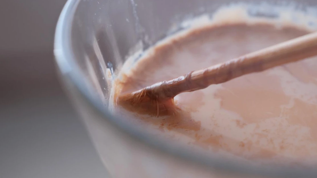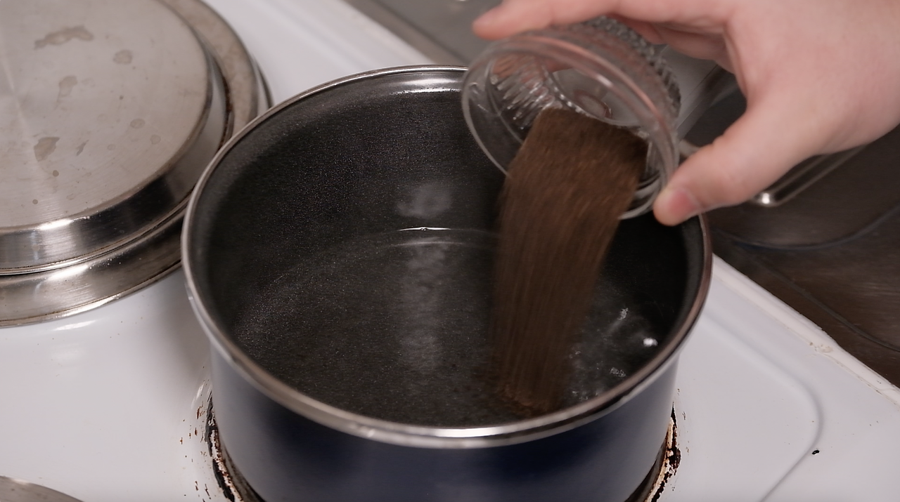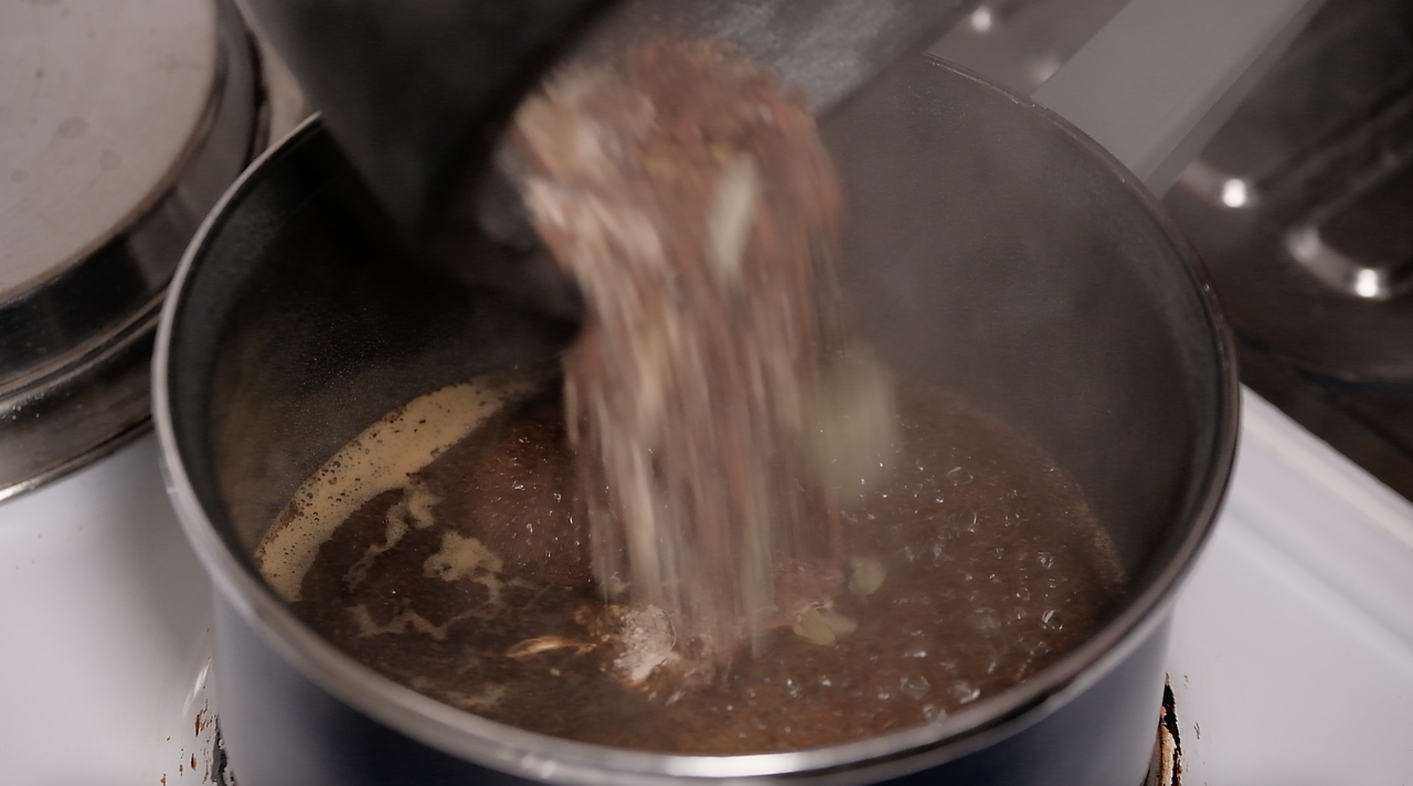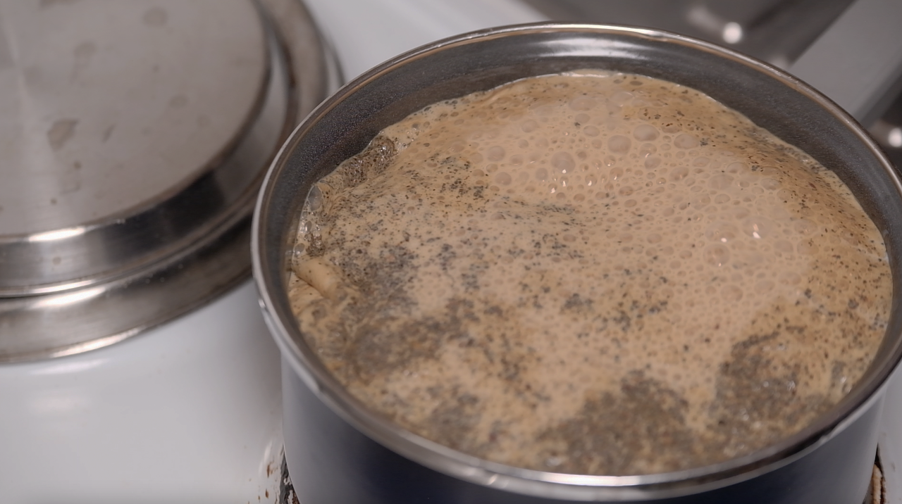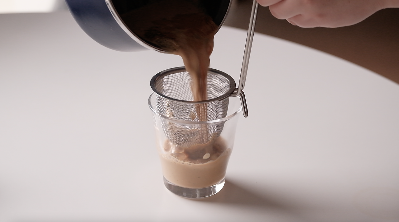 우유가 끓어오르면 불에서 내린 뒤 거름망에 걸러줍니다.