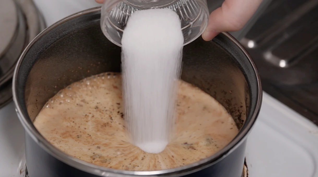 중불에서 3분간 끓이다가 우유 1컵, 설탕 2T을 넣고 다시 끓어오를 때까지 기다립니다. (약 5분)
