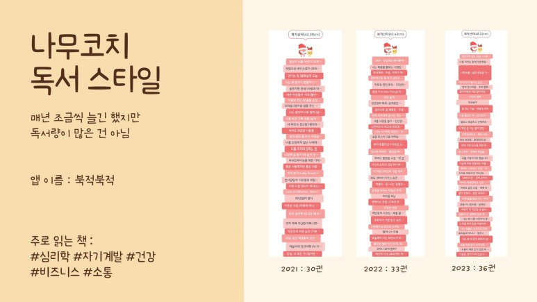 내가 책의 영향을 받아 예전과 다르게 살고 있구나30대에 꾸준하게 책을 읽었고 40을 바라보는 지금 눈부신 성장을 했구나.이게 바로 꾸준한 독서의 힘이구나