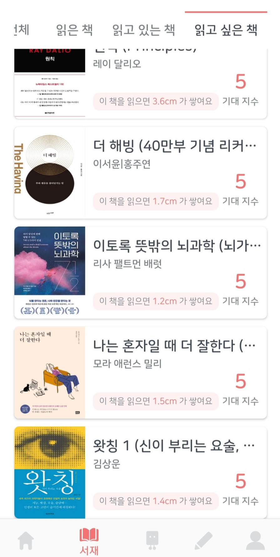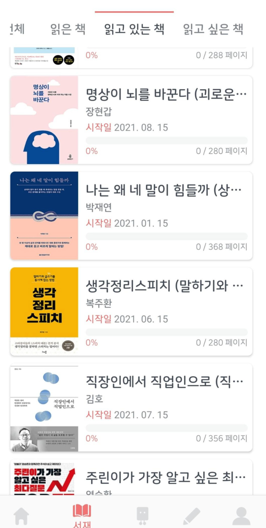 어떤 책을 읽다 말았는지 가끔 잊어버리는데 이렇게 관리할 수 있어서 좋다. 나의 '읽고 있는 책'들은 다들 좋은 책이지만, 실습을 좀 하면서 읽고 싶은데 나의 귀차니즘으로 실습하는 것을 미루다 보니 읽는 것도 미루게 되는... 미안한 책들이다. 읽고 싶은 책들은 지인분이 추천해주거나 개인적으로 읽고 싶은 책을 YES24 장바구니에 넣어 관리했었는데 이젠 이 앱으로 관리하면 될 것 같다!