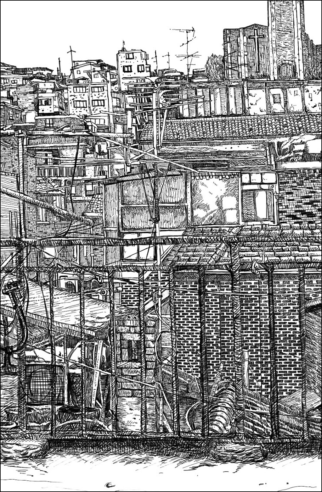 옥탑 너른 마당을 길게 서성이며 다시 못 볼 풍경을 흝었다. 들쑥날쑥, 얼기설기 서로 기대고 맞댄 모양새가 우리네 사는 모습 같아 새삼 정겹고 한편 처연했다. 재개발에 누군 웃겠지만 속절없이 터전을 등져야 하는 사람들은 얼마나 서러울지. 내 처지도 발등에 불인데 오지랖이 깊었다. 서대문구 북아현동, 짙게 그리울 이곳을 꾹꾹 눌러 가슴에 담았다.