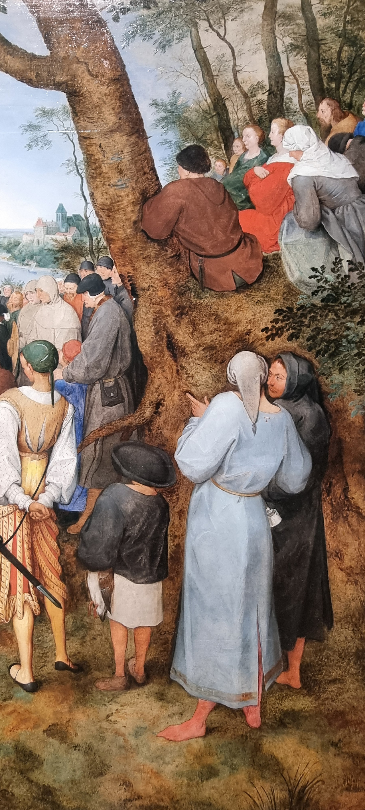 동서고금을 막론하고 어디에나 있는 사람 또 있습니다. 바로 의심 많은 사람이에요. 얀 브뤼헐(Jan Brueghel)의 ‘세례 요한의 설교’를 보면 멀찍이 떨어져 쑥덕대는 사람들이 보입니다. 짝다리를 짚고 손가락질하며 흉을 보는 듯한 모습, 무슨 말을 해도 의심하는 사람들의 딱 그 행태네요.