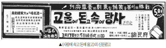 1938년 1월 설날에 부민관(태평로에 있는 옛 국회의사당)에서 있었던 <사랑에 웃고 돈에 울고> 신문광고