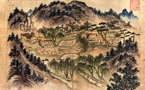 초의선사가 그린 <다산초당도>. 아래 위로 연못이 있고, 집 뒤편에 괴석과 파초가 있다.