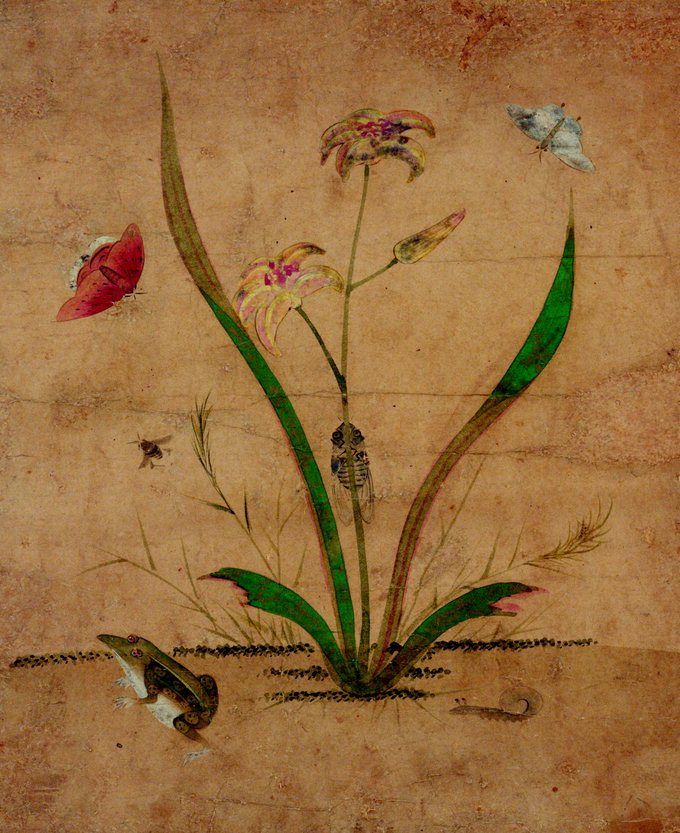 4년 전에 고국에 갔을 때, 이 그림을 본 적이 있는데 꽃과 채소, 나비, 매미 등의 벌레를 정물 묘사하듯 생동감 있게 그린 것을 보고 감탄했던 기억이 있다. 특히 원추리를 그린 ‘원추리와 개구리’는 여성 특유의 세밀함과 서정성까지 담긴 작품이다. 세 송이의 붉은 원추리꽃 주변으로 여름에 볼 수 있는 벌레와 곤충들을 모두 초대했다. 개구리는 주위를 경계하며 튀어 갈갈 듯한 자세이고 원추리 줄기에 붙어 있는 매미는 구성지게 노래하는 듯하다. 오른쪽에는 달팽이가 힘들게 기어 온 모습으로 숨을 고르고 있고, 왼쪽 하늘에선 붉은 나비가 벌과 함께 춤추고 있다. 오른쪽에는 흰나비가 이제 막 꽃 속으로 들어가 꽃가루를 묻히고 나올 것 같다. 찢어진 잎사귀와 꽃잎도 시들시들한 그대로다. 원추리 꽃은 하루를 넘기지 못하는 일일화여서 실제로 원추리를 자세히 보면 성한 꽃보다는 시든 꽃을 많이 보게 된다.