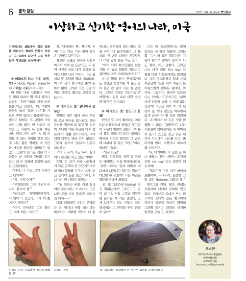 라고 말한다. 그리고 나는 내가 배운 Hot dog! 표현을 다른 사람들에게도 말해줬다. 마치 유치원생이 집에 가서 부모님께 ‘오늘 내가 배운것’을 자랑스럽게 말하듯 말이다. 아아아. 그렇하다. 영어가 모국어가 아닌 나는 언제나 이런식으로 ‘성인 아이’ 취급을 받을 수 밖에 없는 것인가! 이것은 내가 미국에 살면서 또 하나 겉으로 아무렇지 않게 넘어가야 할 작은 언덕이다. 내 영어는 내 모든 것을 말해주지 않는다. 그러면서도 나는 미국인들이 받아들이는 내 이미지와 내 스스로 갖고 있는 내 자아상 사이에서 시소를 타고, 줄타기를 한다. 어쨌거나 이야기를 마치자면,