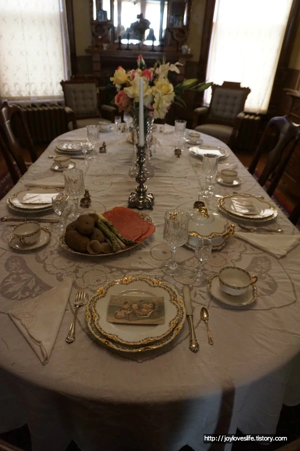 19세기 후반은 빅토리안 사회의 문화라고 한다. 그래서 몰리 브라운 식구 역시 이같은 식탁에 모여 코르셋을 입고 2-3시간에 걸친 10코스가 넘는 식사를 매일 한다. 가이드 분이 실제로 코르셋을 보여주기도 하며, 당시 여성들의 기준이 되는 허리 인치가 18인치라며 이를 실제로 보여 주기도 한다. 와우, 저런 코르셋을 입고 음식을 먹었다니...... 또한 당시에 사람들은 2-3주에 한 번 목욕을 했으며 몸에서 나는 냄새가 식사에 상당히 방해가 되었을 것이다. 이같은 불쾌함을 없애기 위해, 몰리 브라운 여사의 집 다이닝 룸에는 화로가 있고 그 화로 위에 향신료 가루가 담긴 작은 컵을 가까이 두었다. 일종의 아로마 테라피. 또한 이 다이닝 룸의 천장은 특이하게도 녹색에 거미줄 이미지로 그려져 있는데, 이는 몰리 브라운 여사의 작품이 아니라 이 집의 전주인 여사의 작품이라고 한다. 그녀는 자연, 식물들을 너무도 사랑하였지만 집 주변에 식물원을 만들 여유가 없어서 천장에나마 그림으로 표현했고, 몰리 브라운 여사는 이 아이디어가 나쁘지 않아 그대로 두었다고 한다. 따라서 당시 이 집에 초대받은 사람들이 나중에 자기들끼리 이야기 하면서 '어머, 나도 그 천장에 거미줄 그려져 있는 몰리 브라운 여사 집에 초대 받아 식사를 했다우' 하면서 커뮤니티에서 유명해 지는 수단이 되기도 했단다. 참 머리가 명석하신것 같다. 몰리 브라운 여사가 벼락부자가 되어 이 집을 산 시기는 그녀가 23세 때이다.