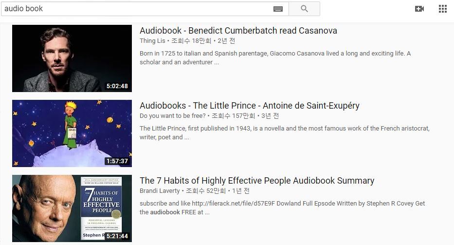 예전에 한겨레센터에서 번역 수업을 들을때 라성일 선생님께서 오디오북의 중요성을 강조또강조하셨는데 그때는 그냥 그렇구나-언제 기회가 되면 들어봐야지라며 검색도 하지 않고있었다. 그러다 한동안 1시간정도 대중교통을 타고 이동할 일이 생겨, 문득 그때의 기억이 떠올라 유튜브에 'Audio book'을 검색해보았다.