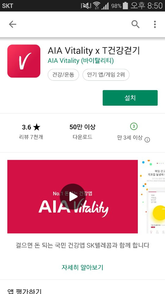 AIA Vitality를 구글 플레이스토어에서 깔면 무료 리워드를 받을수 있다는 사실.