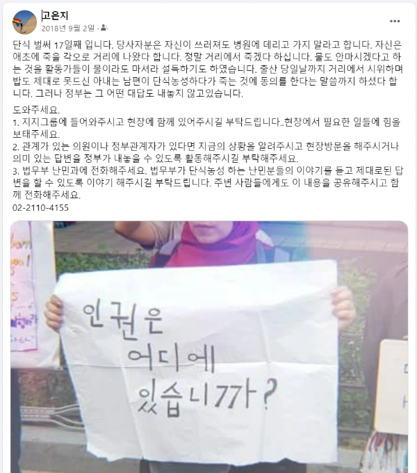 "난민을 향한 인종차별이 가득한 나라에서 저와 제 두 딸이 어떻게 살 수 있을지 의구심이 듭니다. 도대체 누가 우리의 안전을 보장할 수 있는 겁니까? 저희는 안전하고 평화롭게 살기 위해 한국으로 왔습니다. 하지만 한국에 온 지 2년이 지났는데도 심사조차 제대로 받지 못하는 상황입니다. 싱글맘으로서 어떻게 아이들을 양육하고 한국사회에 적응해야 할지를 모르겠습니다. 제가 한국에서 아무런 직장이 없는 채로 두 아이를 양육해야만 하는 이 상황이 과연 정당한 것인지 모르겠습니다." - 사라 , 2018년 청와대 앞 단식농성 기자회견 중