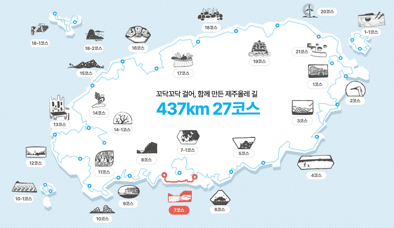 *지도 이미지는 제주 올레 홈페이지에서 따왔으며, 7코스의 길 표기는 당시 걸었던 코스에 맞춰 임의로 수정했다. 앞으로 걸은 코스가 채워짐에 따라 지도에 색을 하나씩 칠해나갈 계획이다. 현 지도에 표기된 437km는 어떻게 합산해도 전체 올레길의 길이와는 다른 수치이며, 언젠가 본문을 통해 언급할 일이 있으리라 생각한다. 지금 현 시점의 올레길은 (홈페이지에 기재된 길의 km수에 따라) 모두 더하면 403.2km이며, 두 갈래로 나눠진 3코스와 15코스의 B코스까지 다 더한다 하더라도 430.8km이다.