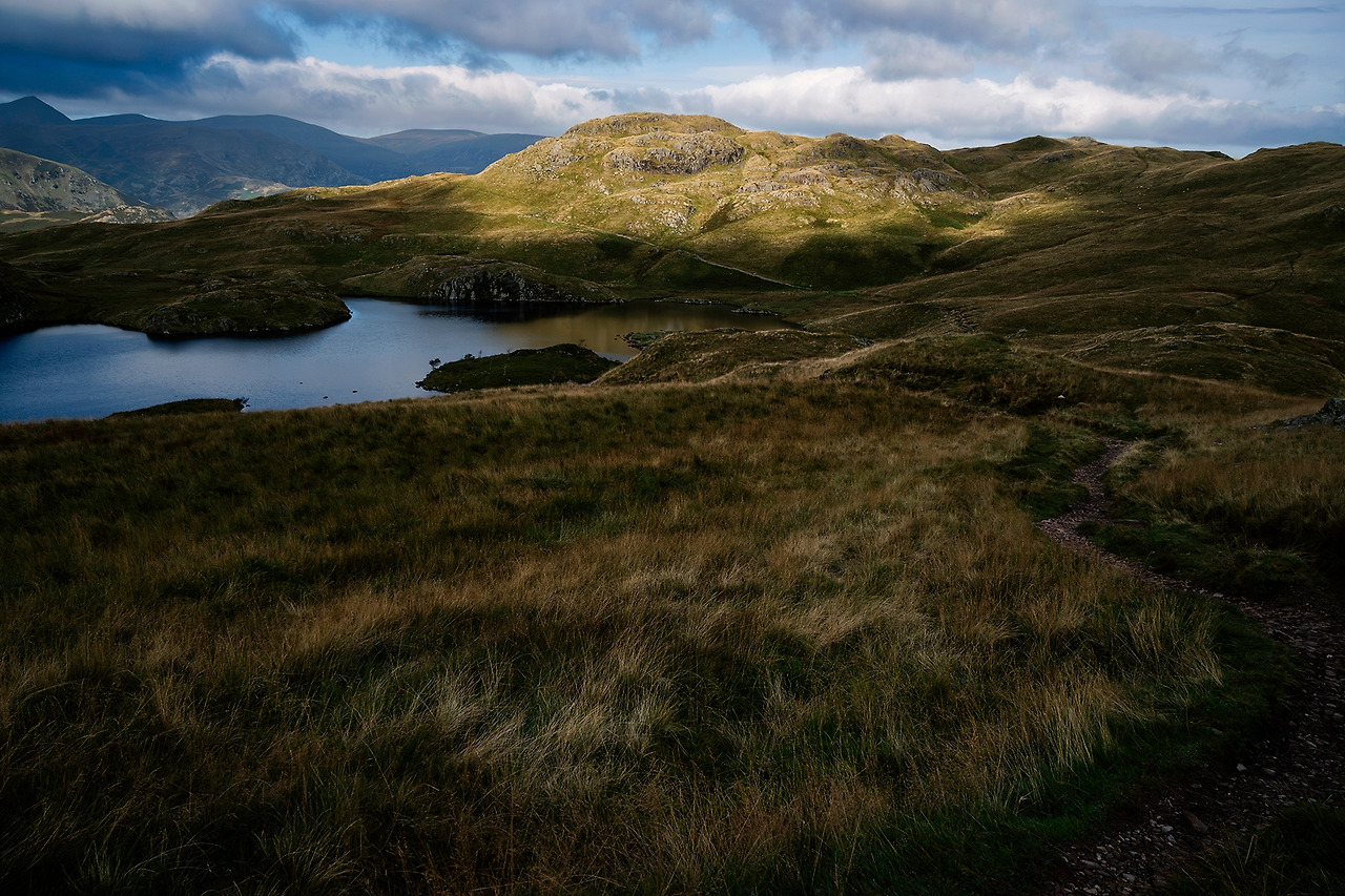 10시 반, 오늘의 최고봉 567m 앵글탄 봉(Angletarn Pikes) 바로 옆을 지났다. 약 530m 정도 높이의 능선을 넘어가는 길이었다. 봉을 지나자 이제 호수가 나온다. 봉의 이름과 같은 앵글 호수(Angle tarn)다. 가장자리를 따라 크게 도는 길, 보는 방향에 따라 호수의 빛깔이 변해서 아름다웠다. 역광의 짙은 그림자와 하늘을 품은 푸른 수면이 함께 빛났다. 호숫가에 앉아 여유를 즐기는 어느 연인이 참 부러워 보였다. 이곳에 함께 있는 일상을 괜히 상상해 본다. 반짝반짝, 정신 차리라는 듯 먹구름이 걷히며 갑자기 햇빛이 왈칵 쏟아졌다.
