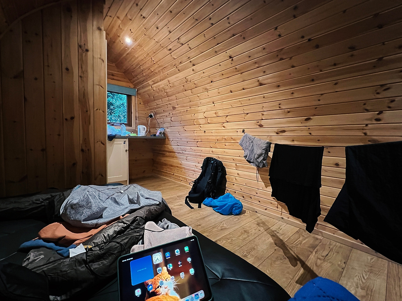 추울까 걱정했는데 작은 히터가 있어 덕분에 썩 따뜻했다. 침낭을 꺼내 깔았다. 베개는 옷가지로 대신했다. 나뭇가지에 널어둔 빨랫감을 모두 방 안으로 옮겼다. 아팠던 뒤꿈치를 보니 작은 물집이 생겨 있었다. 막바지에서야 생긴 물집이라니 어이가 없었지만, 뭐 귀엽게 봐주기로 했다. 터뜨릴까 말까 하다가 일단 그냥 두기로 했다.