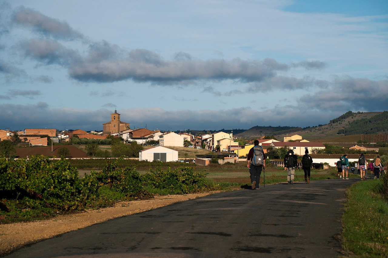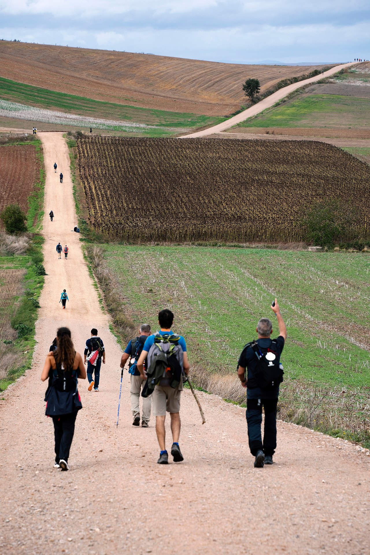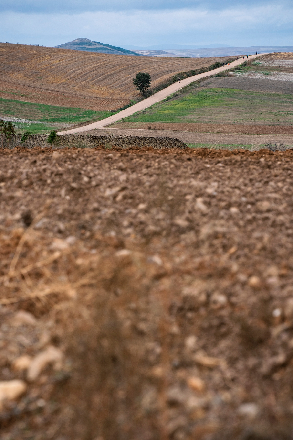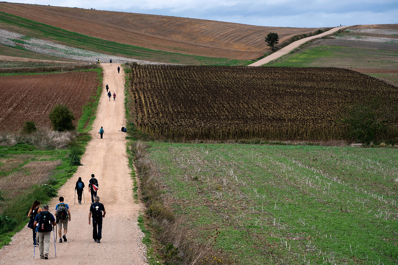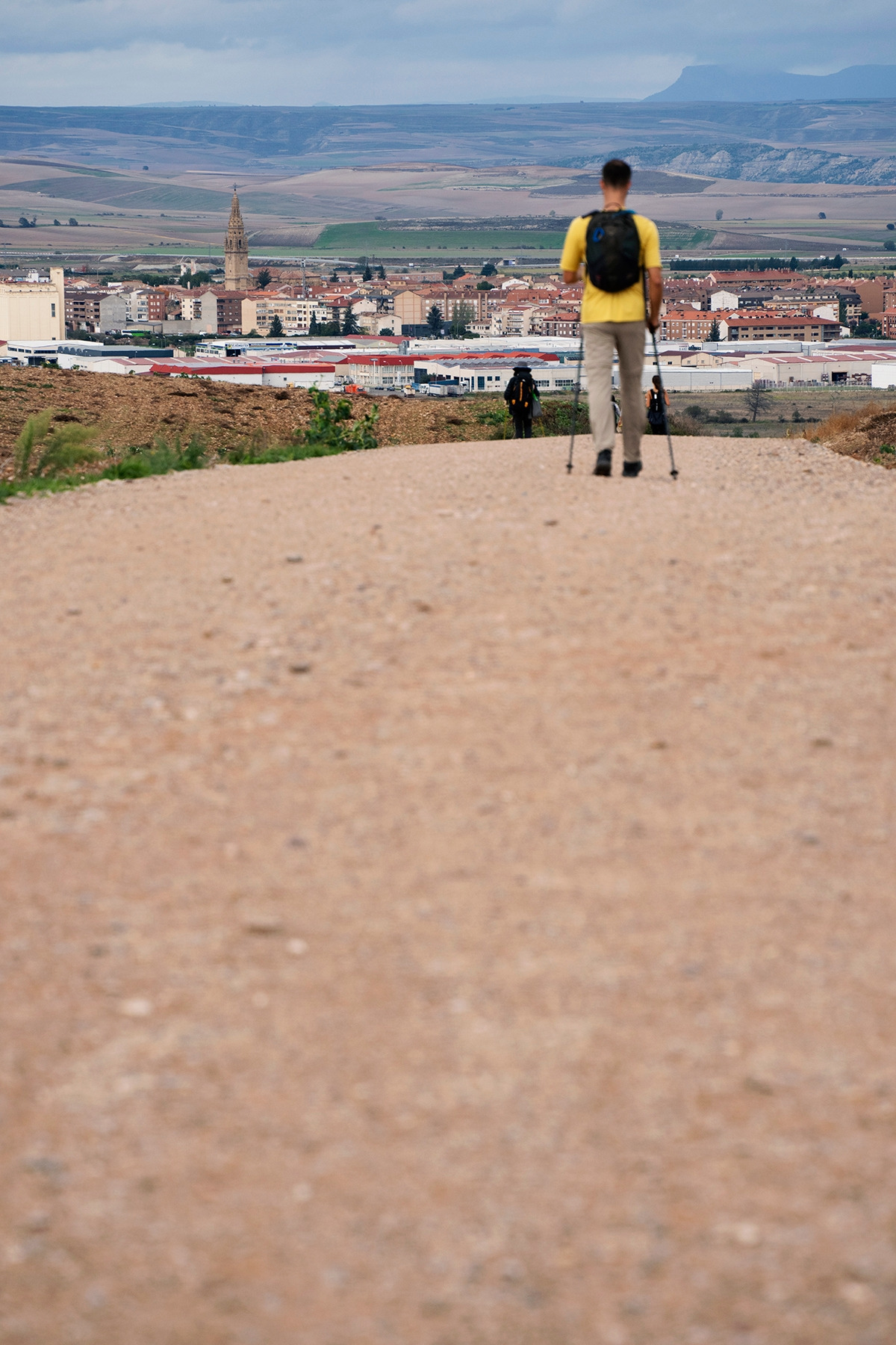 마을을 벗어나며 12시 종소리를 들었다. 주변의 건물이 싹 사라지자, 한가닥의 길은 앙상한 밭 사이로 굴곡지며 나아가기 시작했다. 하늘과 멀지만 또 가까웠다. 낮으나 사방이 틔여 높이 오른 기분이 들었다. 여기가 아마도 오늘 길의 하이라이트. '산티아고순례길'하면 흔히 떠오르는 낭만적 분위기가 길 위로 흘렀다. 지저귀는 새소리가 반갑다. 봄이나 여름이었으면 완전히 달랐을 풍경, 이 가을엔 황량한 아늑함이 있었다. 주변의 산세가 어우러져 아름다웠다. 유연한 곡선을 타고 천천한 길을 따라 가자, 멀리 저 멀리 산토도밍고가 서서히 보이기 시작했다.