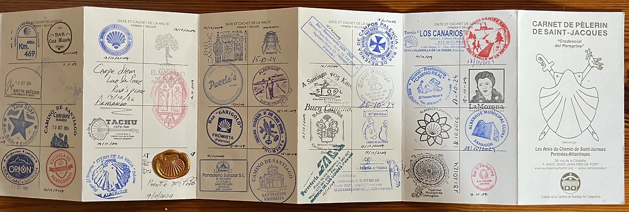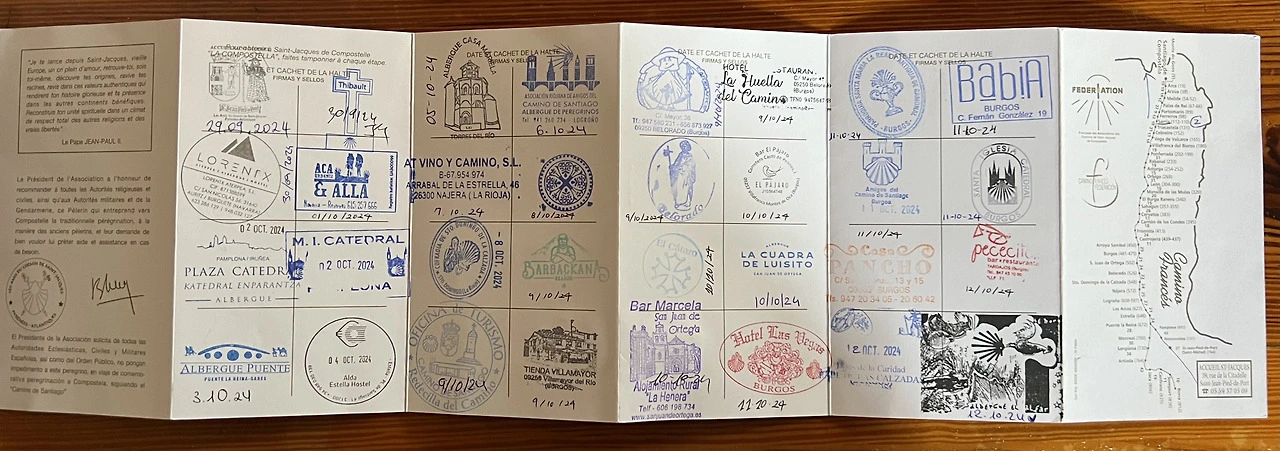 돌아오는 길 마을을 둘러 마트에도 들렀다. 사과 등 간식거리를 샀다. 곧장 알베르게로 향하지 않고 골목을 더 구경했다. 적당한 Bar로 들어가 늦은 점심과 함께 맥주도 한 잔 마셨다. 여기서 받은 세요(sello)를 마지막으로 어느덧 생장에서 받은 순례자 여권(Credential)의 빈칸이 꽉 찼다. 걸은 지 10일쯤 지난 벨로라도(Belorado)에서부터 열심히 찍기 시작해 이렇게 채워졌다. 처음부터 부지런히 찍지 못한 것이 못내 좀 아쉽긴 했다. 생장의 첫 숙소에서는 아예 세요(sello)를 받을 생각조차 못했다. (그러고 보니 그 알베르게의 주인장은 왜 물어보지도 않았을까. 보통은 체크인 시 순례자 여권부터 보여달라고 한다.) 중간 증명서에 더해 꽉 찬 크리덴셜까지, 뭔가 뿌듯한 기분이 들었다. 이제 새로운 순례자 여권(Credential)을 채워 나갈 차례다. 그건 부르고스(Burgos)에서 진작에 사 두었다.
