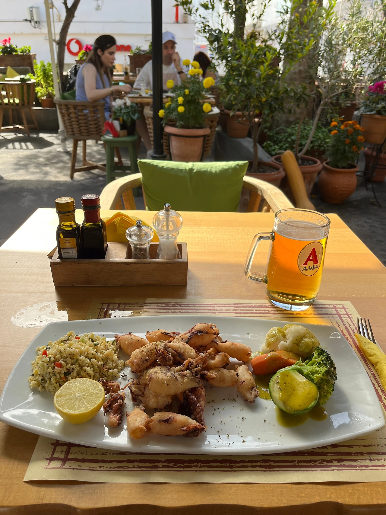 이르지도, 늦지도 않은 시간에 일어나 짐정리 한 뒤 체크아웃 하고, 남은 시간 동안 피라 마을을 더 둘러볼까 싶다가 더운 날씨에 굳이 움직이고 싶은 마음은 없기에 근처 식당에 들어가 오전부터 오징어 튀김에 맥주 한 잔 시켜두고 시간을 보냈다. 오징어 튀김은 크로아티아 때와 달리 퀄리티도 별로인 데다 그다지 싼 편도 아니라 썩 만족스러운 식사는 아니었지만, 그래도 휴양지 식당의 따듯하고 여유로운 분위기는 참 좋았다.