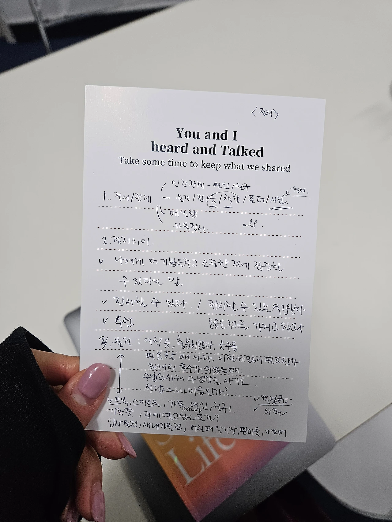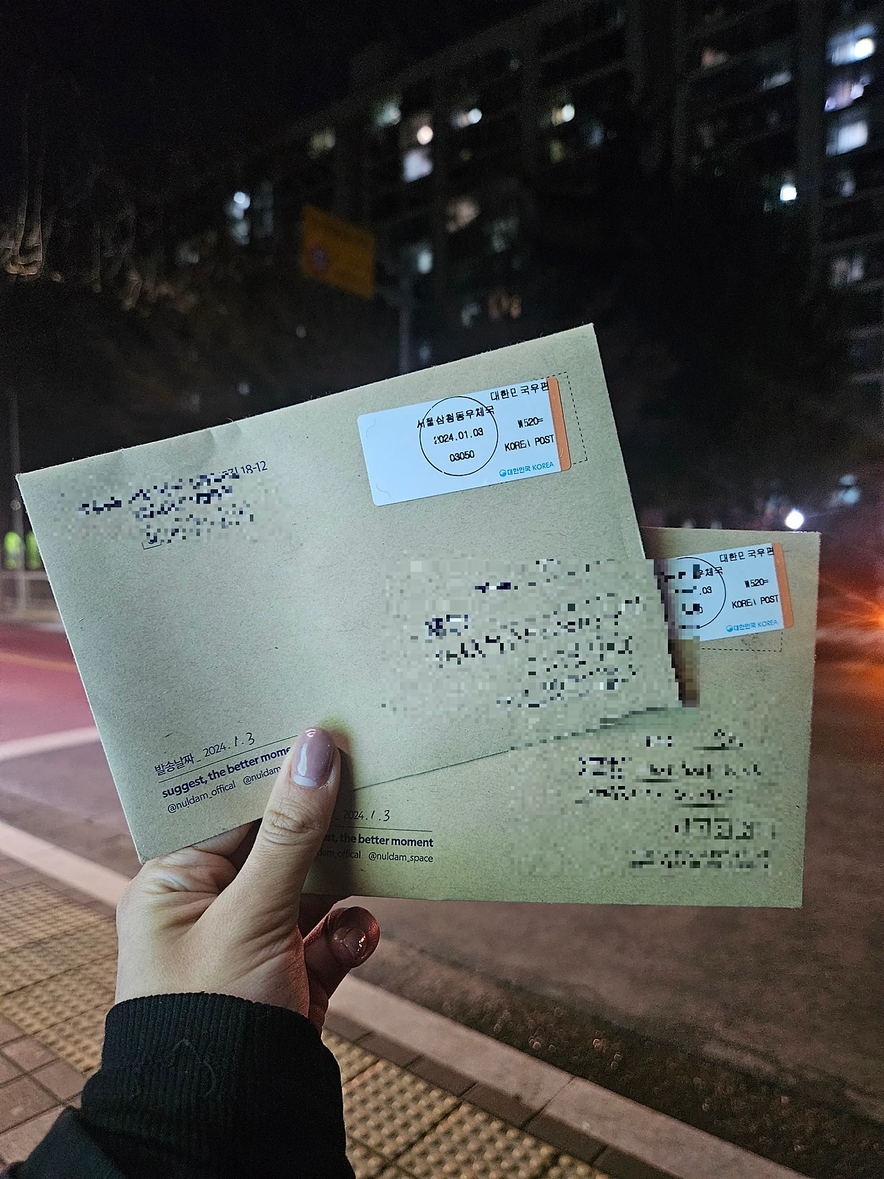그런 가벼워진 마음으로 (작년보다 조금 늦게) 1년 후 나에게 보내는 편지를 쓰고 왔다. 이번에 쓴 편지는 25년 1월 초에 받게될 편지로, 어떻게 24년을 보낼지, 보냈을지 등 그려보며 썼다. 막상 쓰려면 할 말이 없다가도 만들고 그렇게 엽서 한 면을 채웠다. 그리고 24년 1월 초에 내가 나에게 썼던 편지를 받아서 읽었다! 작년은 회고글(23년 회고글)에서 썼던 것 처럼 내가 할 수 있는 만큼 해본 편이라서 그런지 편지에 적었던 대로, 직접 해본 것이 있어서 만족감이 있었다. 남아 있던 부채 털이를 하고 올해를 조금 늦게(?)시작하는 감이 있지만, 앞으로 더 아쉽지 않고 의미 있는 시간을 많이 보내야 겠다고 다짐 해본다.