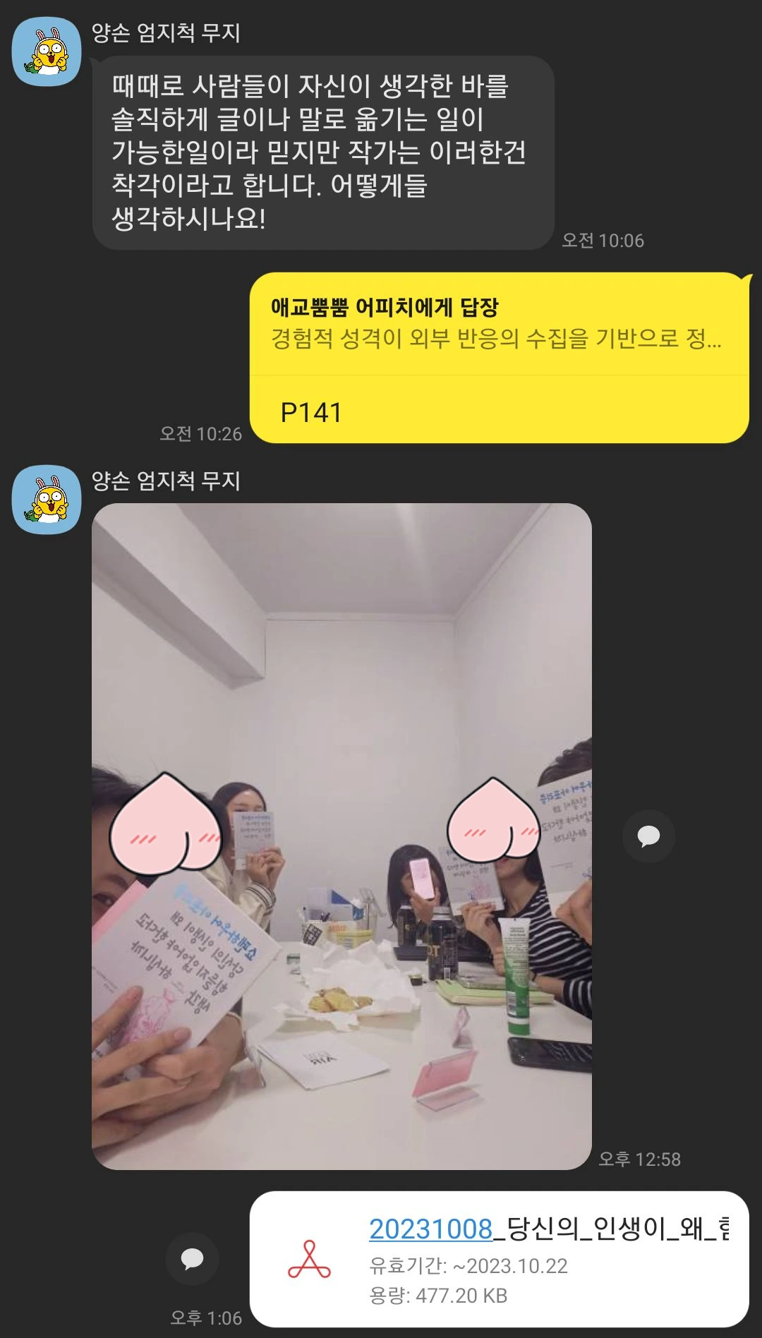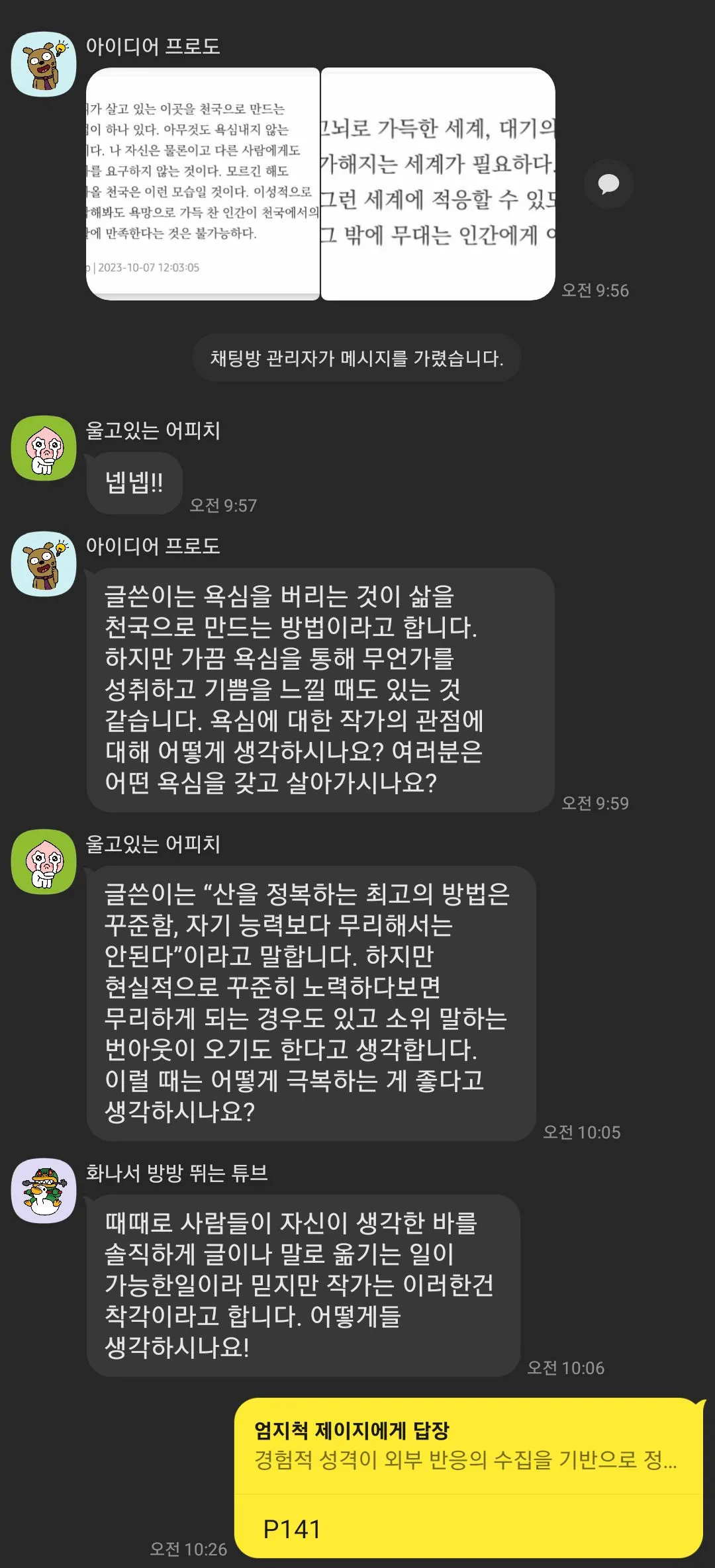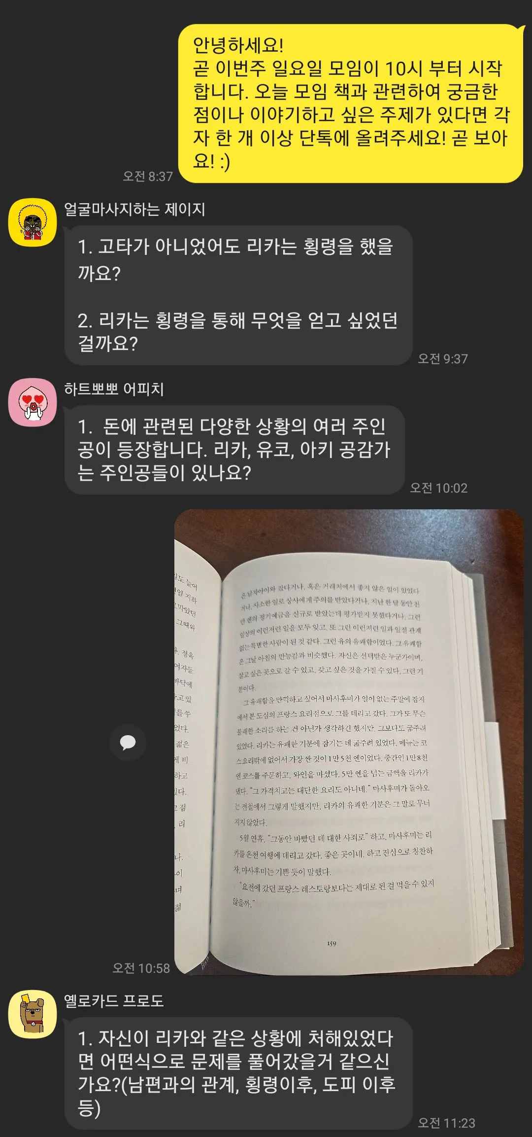 네 번째 이유는 나를 돌아보는 기회가 되었다. 모임을 운영하면서 스스로를 알 수 있는 상황들이 있었다. 나는 사물보다 인간에게 관심이 있고, 이렇게 오래 독서모임을 운영하는 걸 보니 진짜로 대화하고 사람들 만나는 걸 좋아하는 것 같고, 서로의 생각을 정리하고 요약하고 이해하고 이해를 도와주는 것이 어렵지 않았지 않다고 느꼈다. 동시에 나의 일의 특성도 돌아보고, 앞으로는 어떤 일을 하면 좋을지에 대해서도 참고하려고 했다. 그리고 나는 꾸준히 모임 운영을 유지하기 위해서(스스로도 책임감을 부여하는 방식으로)유료로 모임을 운영한다. 그리고 멤버들에게 새로운 멤버 유입을 통해 더 좋은 대화나, 경험을 공유하기 위해서 모임 홍보를 하려고 하지만, 생각보다 나는 관종이 아니고 마케팅 등에 크게 재능이 없다는 것을 깨달았다...(알고 있었지만 더욱이 확인 사살이 되었고) 내가 어려워 하는 영역은 조력자가 있는게 더 좋겠다는 생각을 했다.