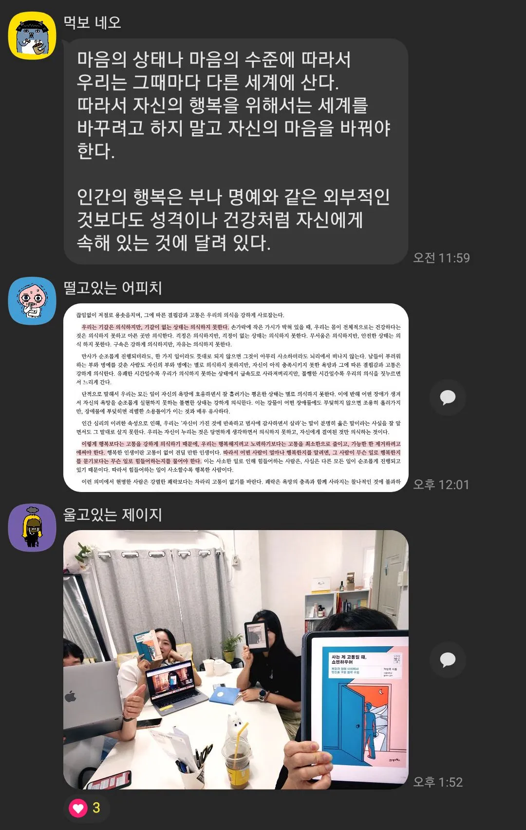 세 번째로 나와 결이 맞는 소수의 사람을 만날 수 있었다. 사실 먹고 사는 일과 무관한 독서는 대부분의 사람들에게 삶의 우선순위 일리가 없다. 요즘에는 특히 재테크나 자기계발 영역의 도서를 읽기도 바쁠 수 있다고 생각한다. 그런데 굳이 책을 읽고 사람들과 이야기하는 시간을 쓰고 참가비용을 내는 의지가 있는 사람들은 분명 자기 계발, 생각, 대화, 가치관 , 성장 , 본인 등에 대한 집중을 하고 있다고 생각했다. 극소수일지라도, 서로 영향을 주고 받을 수 있는 사람들을 만날 수 있다면 설레지 않을 수 있을까! 5년 동안 (무수하지 않지만.) 모임에 오가는 사람들을 만났는데, 고인물 멤버가 되는 사람들을 나와 결이 맞는 소수의 사람들이었다. 스쳐가는 인연에 불과할 수도 있지만, 모임하면서, 점점 많이 이야기들로 서로의 성향과 스타일이 읽히다 보니 알게되고 함께 이야기하는 것이 고마워지는 순간이 오고, 다양한 일신상의 이유로 모임 참여가 어려워지면 아쉽고 안타까움이 올라오는 순간이 존재하기도 한다.