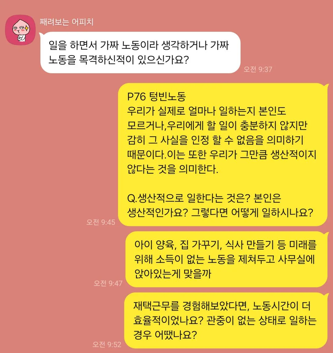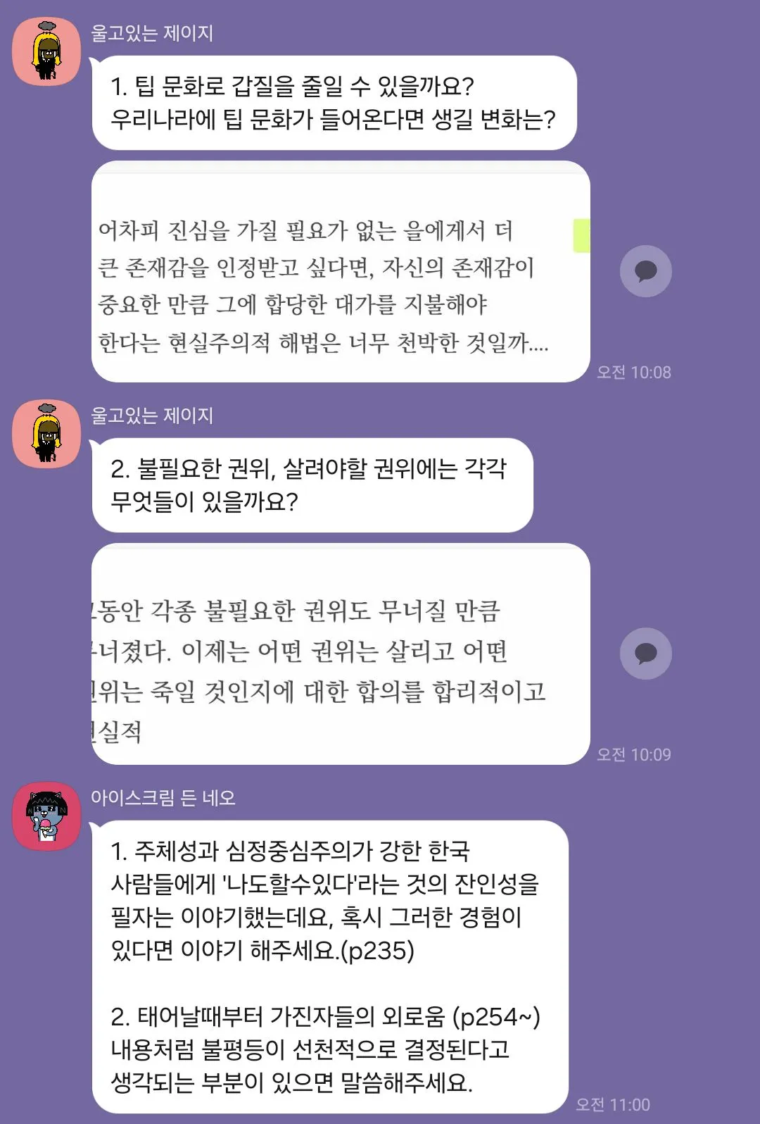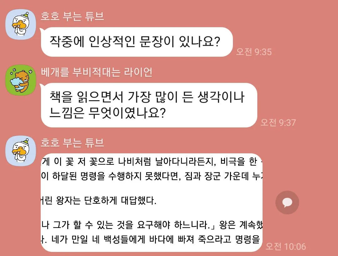 첫 번째로 다양한 사람들을 이야기를 들을 수 있어서 좋았다. 외향적인 성향인 나로써 다양한 백그라운드의 사람들의 다양한 의견이 들을 수 있다는 것이 너무 즐거웠다. 대학생, 초등학교 선생님, 유치원 선생님, 의사 선생님, 외교관, 엔지니어, 마케팅, 운영기획자 등 내가 만나보지 못하고 생각도 하지 않았던 분야의 사람들의 하는 생각과 배경 지식을 알게되는 것이 너무 좋았다. 연결 고리는 책이지만, 그로 인해 나오는 다양한 주제와 입장들은 들을 때, 나의 이해의 폭을 조금씩 넓히고 있다고 느꼈다. 회사, 학교, 커뮤니티 등에서 가볍고 사회적 매너 상의 얕은 대화에 질리거나 갈증이 있었는데, 계속 대화가 연결되는 희열감을 경험할 수 있었다.