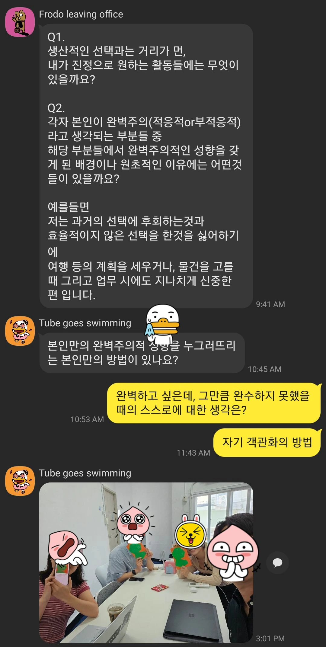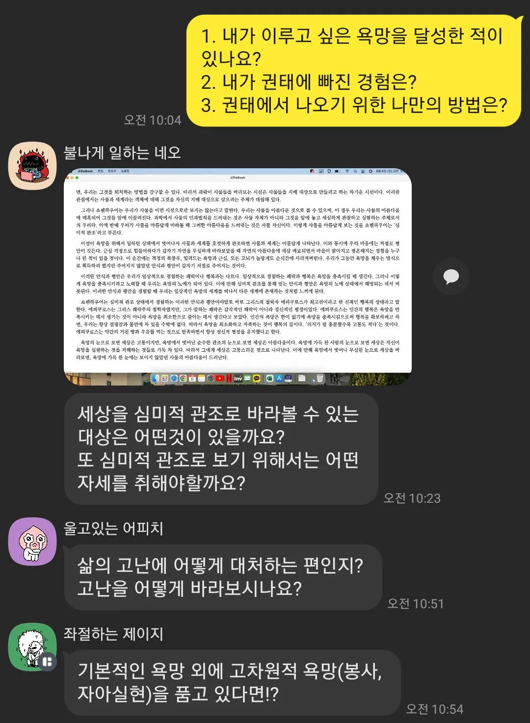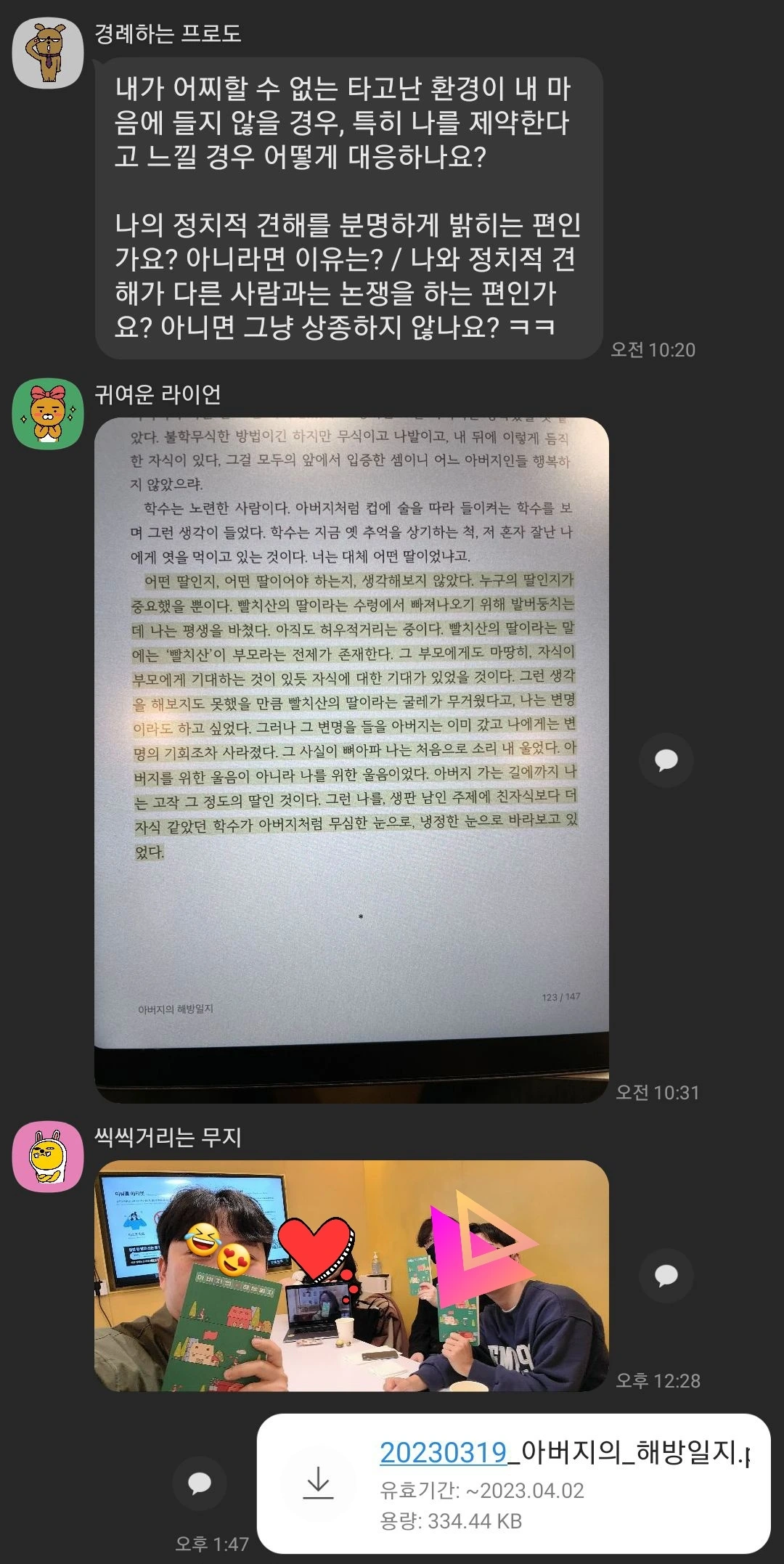 첫 번째로 다양한 사람들을 이야기를 들을 수 있어서 좋았다. 외향적인 성향인 나로써 다양한 백그라운드의 사람들의 다양한 의견이 들을 수 있다는 것이 너무 즐거웠다. 대학생, 초등학교 선생님, 유치원 선생님, 의사 선생님, 외교관, 엔지니어, 마케팅, 운영기획자 등 내가 만나보지 못하고 생각도 하지 않았던 분야의 사람들의 하는 생각과 배경 지식을 알게되는 것이 너무 좋았다. 연결 고리는 책이지만, 그로 인해 나오는 다양한 주제와 입장들은 들을 때, 나의 이해의 폭을 조금씩 넓히고 있다고 느꼈다. 회사, 학교, 커뮤니티 등에서 가볍고 사회적 매너 상의 얕은 대화에 질리거나 갈증이 있었는데, 계속 대화가 연결되는 희열감을 경험할 수 있었다.