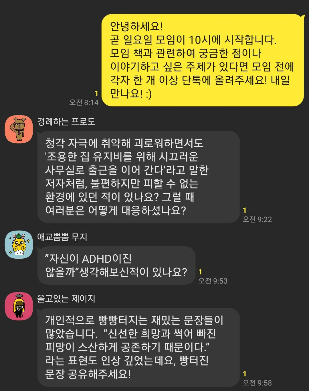 위의 이유와 반대되는 운영하지 않아도 되는, 운영하지 않아야 하는 이유들도 공존한다. 매달 책 선정, 모집 안내, 연락 등 시간과 비용의 인풋 대비 아쉬운 아웃풋, 사이드 프로젝트로 규모를 키우기 부족한 부분, 기회비용 등이 있지만, 지금의 나는 위와 같은 이유로 모임을 운영하고 있다.