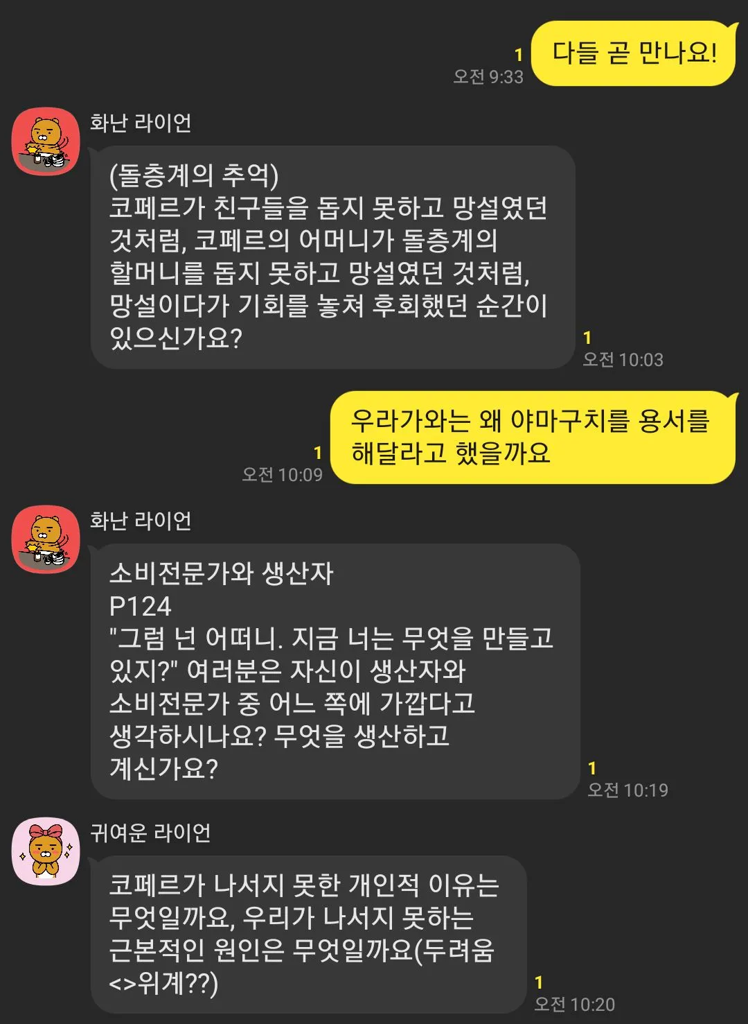 앞으로 이 독서모임이 언제까지 어떻게 운영되고 형태가 변화할지는 그려지지 않지만, 분명한 것은 모임에서 나눈 이야기와 생각, 이해들이 모여서 나와 멤버들에게 좋은 영향을 주고, 삶 속에서 도움이 되고 있기에 5년 넘는 시간 동안 모임을 진행해올 수 있었던 것 같다. 앞으로도 계속해서 책과 대화와 사람들을 통해서 더 멋지게 성장하고 현명한 어른이 되길 바라며, 다음 모임을 준비해야겠다:)