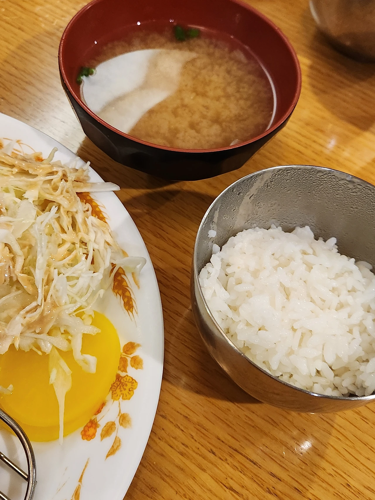 미소된장국과 양배추 샐러드 그리고 밥이