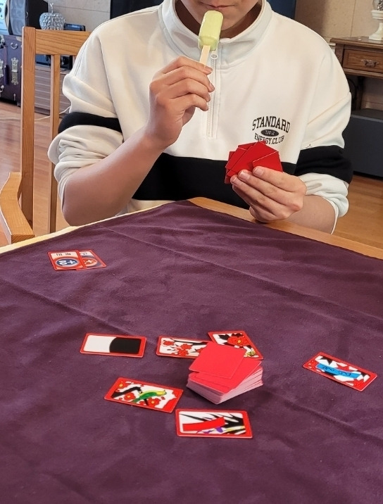 메론바를 쭉쭉 빨며 할머니 옆에서 화투를 흘려 가며 고스톱을 치고 있는 아들.