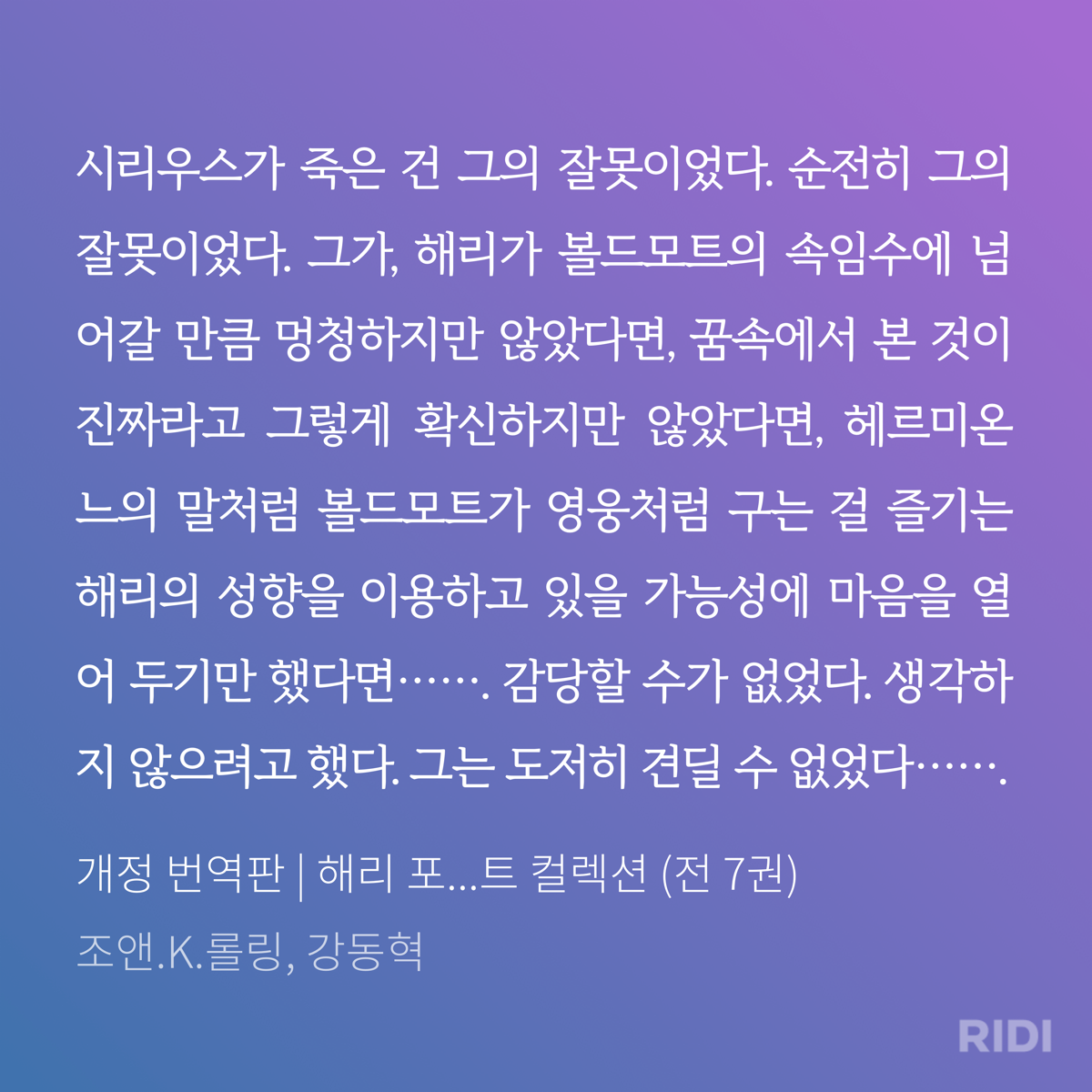 위의 사진은 5권 불사조 기사단의 일부를 발췌한 것이다. 불사조 기사단편 후반부에 해리는 볼드모트와의 정신적 연결을 통해 볼드모트가 시리우스를 해치려는 장면을 목격한다. 수단과 방법을 가리지 않고 당장 마법부로 찾아가 자신의 대부를 구하려고 하지만, 이성적인 헤르미온느가 이를 막아선다. 어쩌면 함정일지도 모른다고 말이다. 결과적으로 헤르미온느의 주장이 맞았고, 마법부에서 죽음을 먹는 자들과 싸우는 과정에서 많은 사람들이 다치고 시리우스는 허무하게 죽어버린다. 물론 그의 죽음을 해리의 실수 때문만이라고 설명할 수 없다. 이는 시리우스의 무모하고 오만한 면, 덤블도어가 해리를 온전히 믿지 못했던 것 등 여러 요인들이 작용한 결과다. 하지만 적어도 작중에서 해리는 대부의 죽음을 온전히 자신의 탓으로 돌린다.