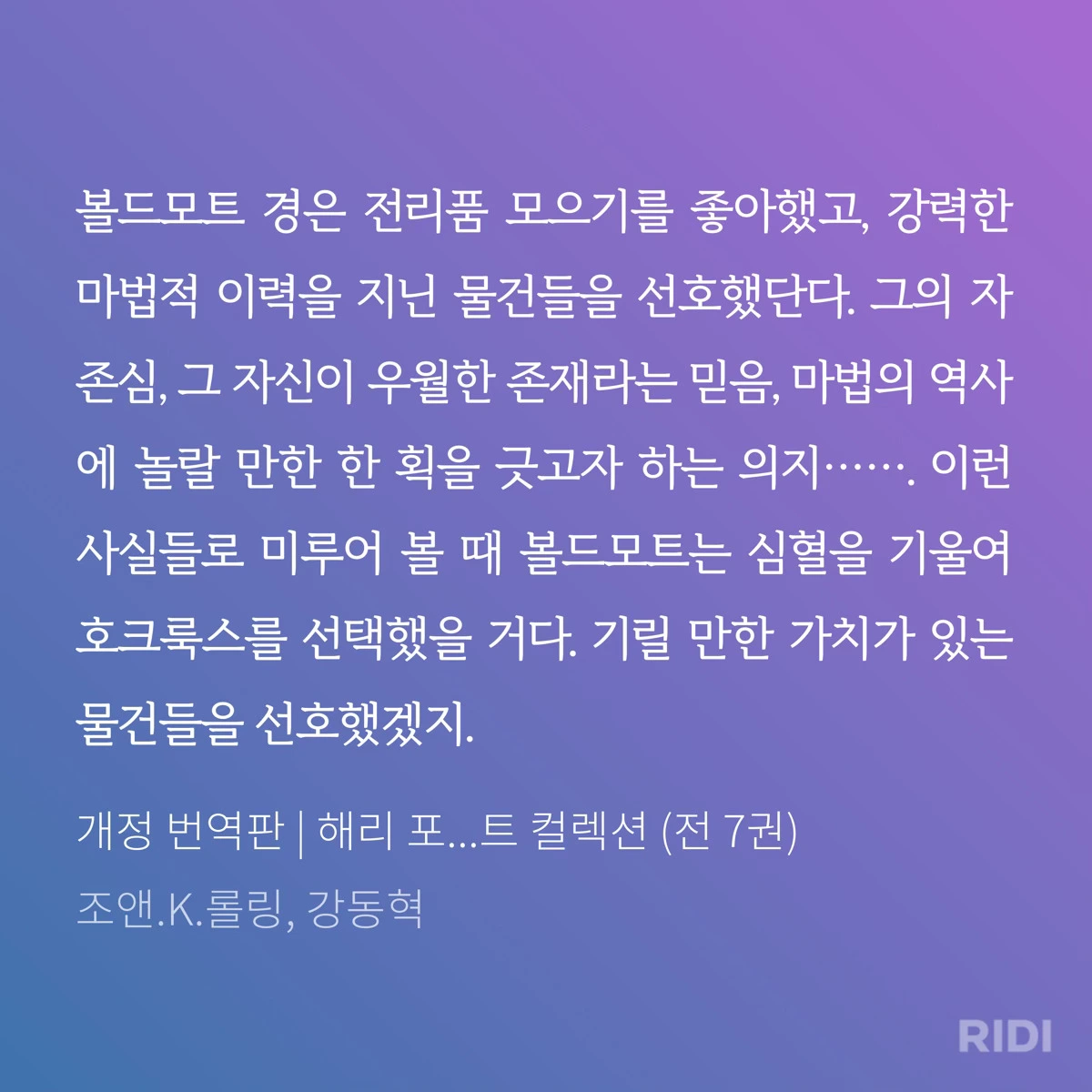 내가 호크룩스들을 소설 속에서 등장하는 순서가 아니라 이렇게 나열한 것에는 이유가 있다. 처음 3가지는 볼드모트 자신과 밀접하게 관련된, 아주 사적인 물건이라는 공통점이 있다. 각각 자신의 어린 시절이 담긴 일기장, 어머니의 가문에서 전해 내려 온 가보, 본인이 항상 데리고 다니는 뱀이니까 말이다. 그리고 뒤에 적은 3가지는 모두 호그와트 설립자들을 대표하는 보물이다. 이런 물건을 고른 것은 볼드모트가 자신을 굉장히 위대하고 특별한 존재라고 여기는 사실을 보여준다. 자신의 영혼을 담아둘 물건이라면 그만큼 진귀한 물건이어야 하니까, '호그와트 설립자'라는 대단한 인물들의 물건이어야만 한다고 생각했던 게 아닐까. 하지만 그 덕에 해리와 덤블도어가 나머지 호크룩스가 어떤 물건일지를 추측할 수 있었고, 끝내 그것들을 찾아서 파괴하기까지 가능했다. 볼드모트의 오만함이 그를 죽음으로 내몰았다고 볼 수 있겠다.