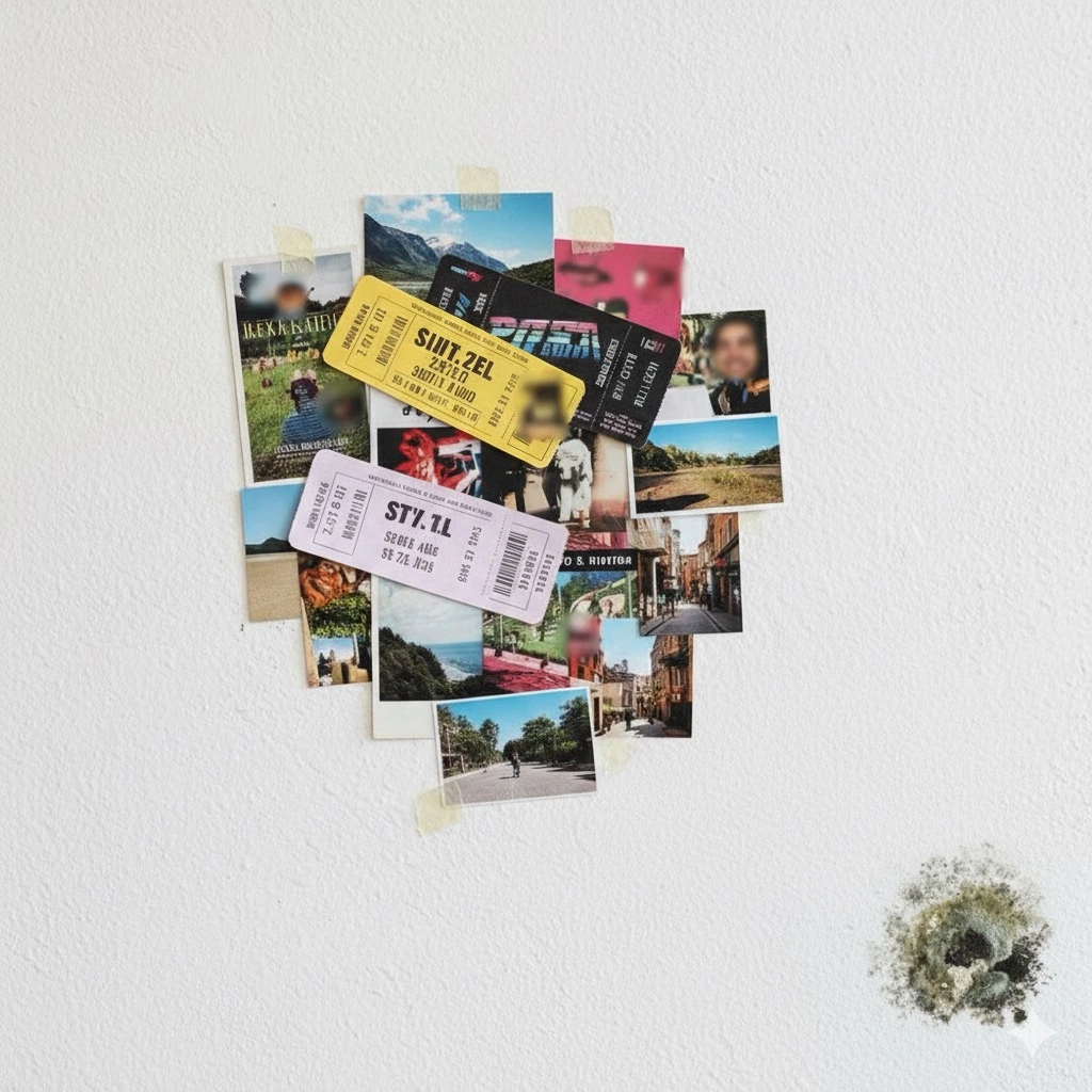어느새 글로 가득 찬 태블릿 화면을 버튼을 눌러 끄고 침대 옆 협탁 한편에 밀어뒀다. 그리고 이불속으로 들어가 알록달록한 맞은편 벽면을 쓱 둘러봤다. ’ 저건 작년인가? 전주 여행 재밌었지… 비빔밥 맛있었는데. 저 콘서트도 좋았어. 다음에 내한 또 왔으면 좋겠다. 이젠 회사에 다녀서 갈 수 있을지는 모르지만.’ 내가 갔던 여행 사진과 콘서트 티켓들을 보며 하나씩 떠오르는 추억들을 감상했다. 저번에는 곰팡이만 보이더니 이제는 행복하고 즐거웠던 기억들이 더 눈에 띈다.