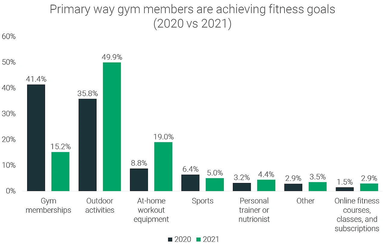 Runrepeat 연구 결과에 따르면 2020년 기존 헬스장 회원을 대상으로 한 연구 참여자 중 41.4%가 헬스장 운동에 참여하였고 35.8%는 야외 운동을 참여하였지만, 2021년에는 연구 참여자 중 야외 운동 참여자가 센터 헬스장 회원보다 3.2배나 많았습니다.