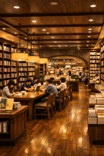 노란 조명은 사람과 책장을 부드럽게 비추며