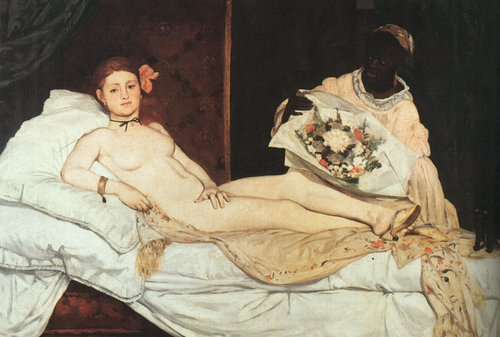 이 그림의 제목은 올랭피아입니다. 올랭피아는 알렉산드로 뒤마가 쓴 당시 유명소설인 춘희에 나오는 창녀의 이름인데 그녀는 순결을 파는 것에 수치심도 없이 얼굴만 믿고 막 나가는 헤픈 여자였죠. 이 소설이 유명해지면서 그 아류로 수없는 연극이 나왔죠. 당연히 올랭피아라는 이름도 유명세를 떨쳤죠. 당시 사람들에게 올랭피아라는 이름이 무엇을 연상시켰는지 충분히 이해되시죠? 이 그림의 실제 모델은 빅토린 뫼랑은 나중에 미술인의 등용문인 살롱전까지 당선된 화가입니다. 사람들은 그녀가 누구인지는 관심이 없었습니다. 다만, 그놈의 불경스러운 제목이 문제였던 거죠.