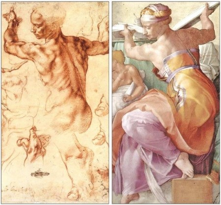미켈란젤로가 그린 천지창조는 천장에 그린 프레스코화입니다. 지난 다빈치 편에서 말씀드린 것처럼 프레스코화는 윤기도 없지만 계속 덧바르며 수정해서 그릴 수 있는 유화와 달리 한번 그리면 수정이 어렵습니다. 이런 점 때문에 미켈란젤로는 그림을 그리기에 앞서 완벽에 가까운 데생을 먼저 그리고 난 후에 천장에 그림을 그렸습니다. 역동성이 강조된 콘트라포스토(미술에서 인체를 표현할 때 무게를 한쪽 발에 집중하고 다른 쪽 발은 편안하게 놓는 구도), 황금분할의 절정을 보여주는 미켈란젤로의 데생은 완전함 그 자체입니다. 윤곽선에다가 빗금으로 명암을 칠해서 완벽한 입체감을 보여주는 그의 데생은 그 자체로도 훌륭한 작품입니다. 계산된 그림의 정수라고나 할까요?