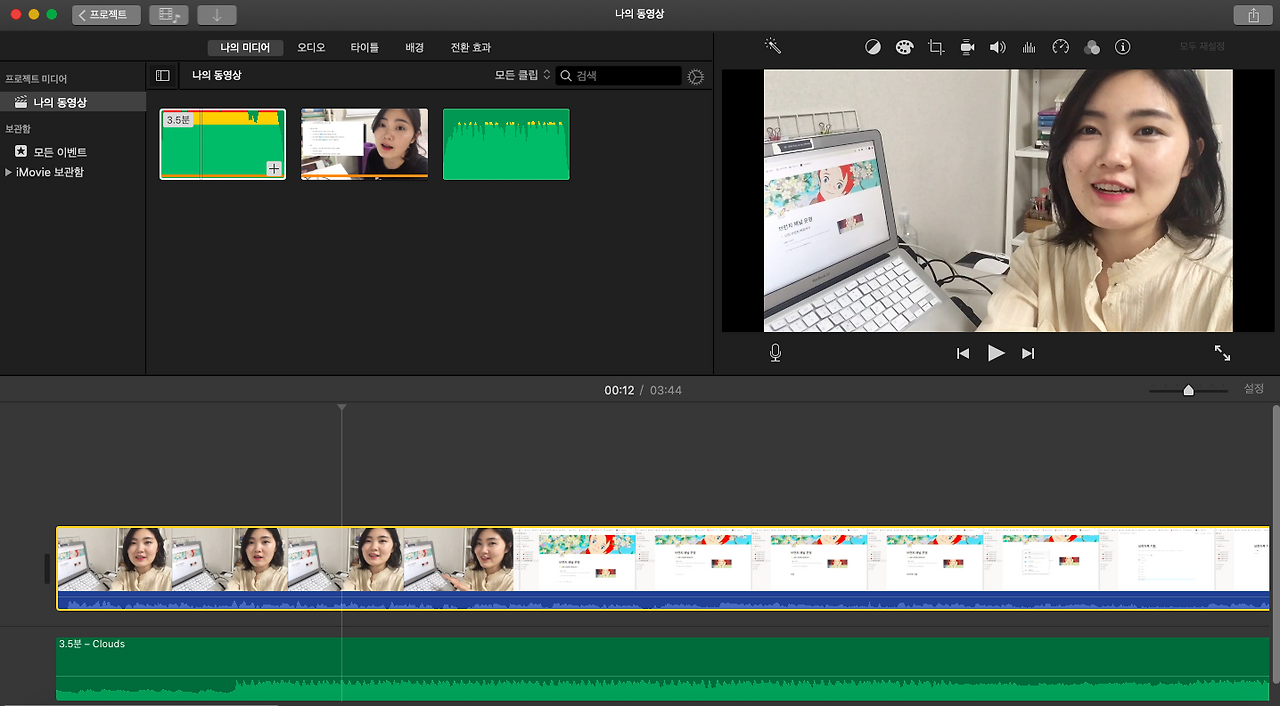 유튜브 이후 달라진 점, 두 번째! '영상의 맛'을 알아간다는 점이다. 사실 이전에 한 번도 영상을 촬영해 본 적도, 편집해 본 적도 없다. 이번 '30일 챌린지 영상' 촬영을 위해 난생처음으로 삼각대를 구매하고, 영상 편집 프로그램도 사용해보았다. 영상을 촬영하고 편집하는 일은 생각보다 수월했다. 나의 경우, 아이폰으로 촬영한 뒤, 맥북의 기본 프로그램인 iMovie를 활용해서 영상을 편집했다. 특별한 장비 없이도 그럴듯한 영상을 만들 수 있다는 점에 엄청난 매력을 느꼈다...!