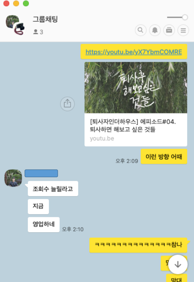 내가 유튜브를 하게 된 계기는, 이전 회사에서 함께 퇴사한 연구소장님의 제안에서 비롯되었다. 퇴사 후 할 일도 없는데 같이 유튜브를 찍어보면 어떻겠냐는 아주 달콤한 제안이었다. 그렇게 소장님을 필두로, 4명의 팀원과 소장님의 귀여운 딸 재인이가 함께 <퇴사자인더하우스>를 만들어 가고 있는 중이다. 처음에는 카메라가 있다는 사실 자체가 어색했다. 카메라 앞에 앉아 이야기하는 것 또한 지금 생각해 보면 아주 부자연스러웠다. 솔직한 심정으로, "과연 이걸 누가 볼까?"라는 생각도 들었다.ㅋㅋ 그럼에도 불구하고, 어찌어찌 같이 하다 보니 벌써 꽤 많은 영상 콘텐츠를 올렸고, 한 달 안에 100명 이상의 구독자를 모을 수 있었다!