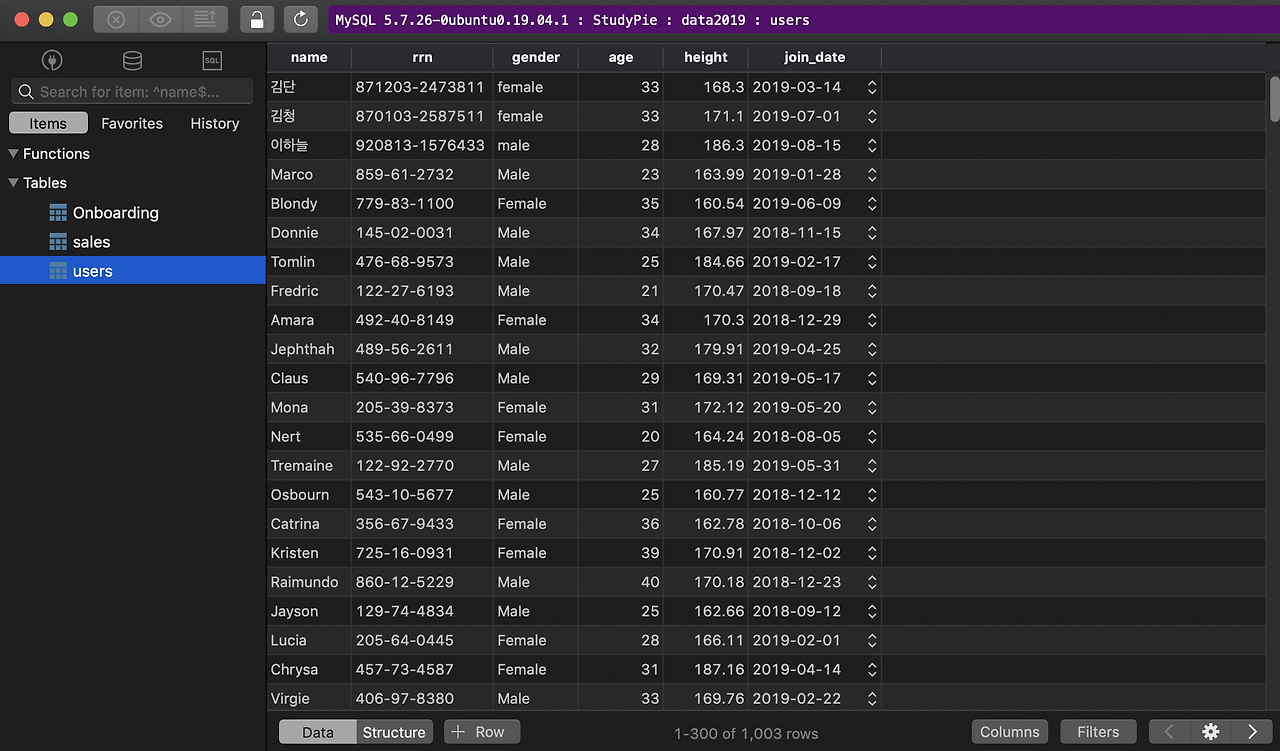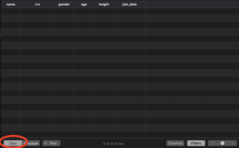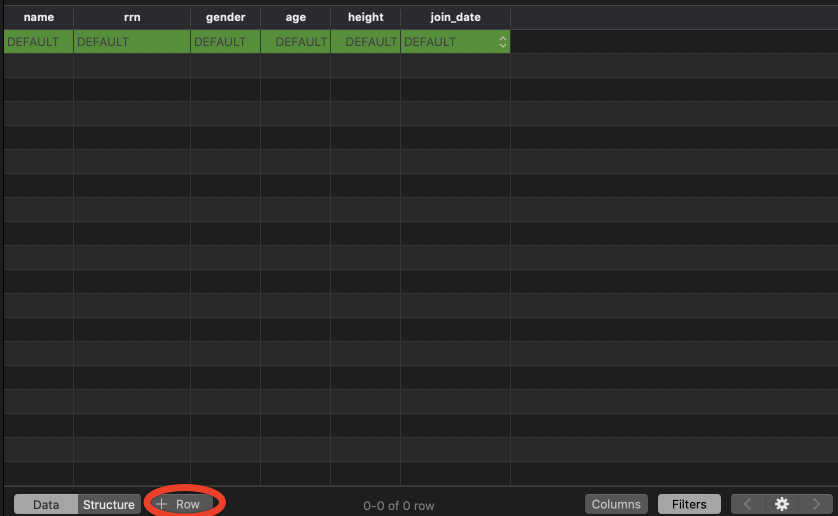 TablePlus에서 지난 시간에 만들었던 users 테이블을 열어보도록 합시다. 좌측 패널에서 해당 테이블을 클릭하면 됩니다. 우측 패널에 중간에 보면 data와 structure 2개의 버튼이 있을 것입니다. structure를 누르면 테이블 생성시 설정했던, 테이블 구조를 보여주게 됩니다. 반대로, data를 클릭하면 현재 선택한 테이블의 데이터 중 일부를 보여주게 됩니다. 우리는 데이터를 추가할 예정이기 때문에, data 탭을 클릭해 아래와 같은 화면을 보도록 선택해주세요.