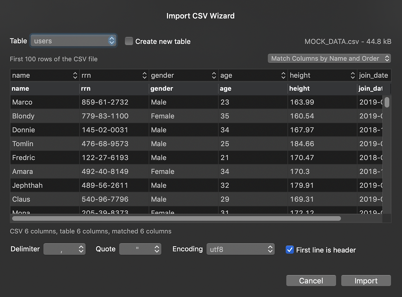 상태창 좌측의 파일 메뉴를 클릭하면 Import 옵션이 있는 것을 확인할 수 있습니다. 이를 클릭하고, From CSV 옵션을 클릭한 후 다운받아 두었던 csv 파일을 선택합니다. 임포트하고자 하는 테이블에 users를 선택하면, 오른쪽 그림처럼 TablePlus는 자동으로 어떤 열이 어디에 들어갈지 매칭을 진행합니다. 이렇게 되는 이유는 csv 파일 첫줄에 열의 이름을 입력해두었기 때문에, 이를 기반으로 한 것입니다.