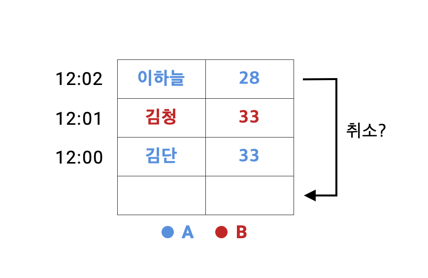 오른쪽 그림과 같이 A와 B는 각자 자신의 컴퓨터에서 서버에 설치된 데이터베이스에 접속해서 사용자 정보를 입력하는 작업을 진행하고 있다고 가정해 봅시다. 12시 00분에 A는 사용자 '김단'에 대한 데이터를 삽입했고, 12시 02분에 사용자 '이하늘'의 데이터를 삽입했습니다. 그 사이 B는 사용자 '김청'의 데이터를 12시 01분에 삽입했습니다. 이하늘의 데이터를 입력하고나서 A가 데이터를 잘 못 입력했다는 것을 깨닫고, 되돌리기를 2번 수행했다고 가정해봅시다. 그러면, B는 자신도 모르는 사이에 자신이 입력한 '김청' 의 데이터가 사라져버리게 됩니다.