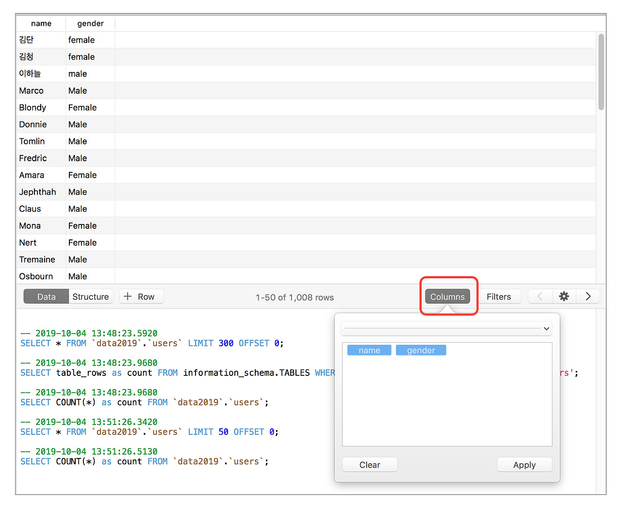 TablePlus의 기본 설정값은 모든 열을 가져오도록 설정되어있습니다. 이 때문에, 여러분이 왼쪽 패널에서 users 테이블을 선택하게 되면, 우측에 users 테이블이 가지고 있는 모든 열의 정보가 보이는 것입니다. 우측 그림과 같이, TablePlus는 이 선택값을 변경하는 옵션을 Columns라는 버튼을 통해 제공하고 있습니다. 이 버튼을 누르면 기본 값으로 모든 Column이 선택되어있는 것을 확인 할 수 있습니다. 위에 있는 메뉴를 클릭해서 원하는 열인 이름(name)과 성별(gender)을 선택해보세요. 선택이후 Apply 버튼까지 클릭하면, 화면에 이름과 성별만 정보만 선택되어 보이는 것을 확인할 수 있을 것입니다.
