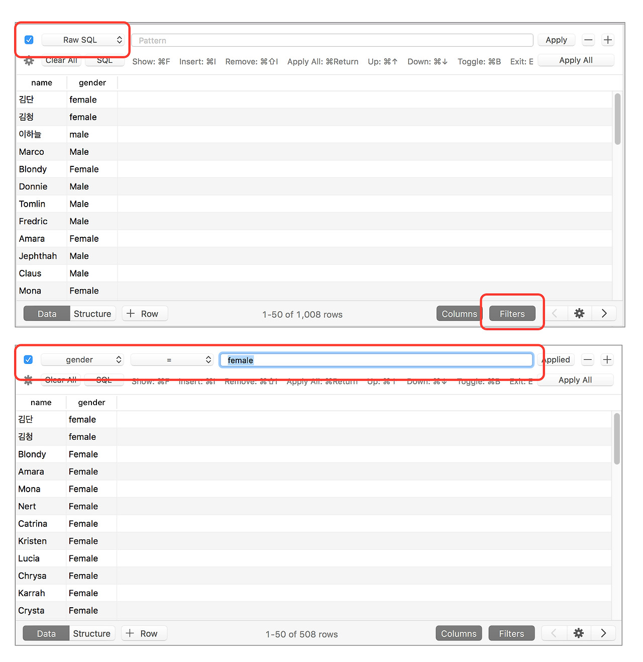 이제 TablePlus를 이용해서 여자(female) 사용자만 선택하는 필터를 만들어 봅시다. 아래 그림을 참고하시면서 차근차근 따라해 보세요. TablePlus 화면 중간에 보면 Filters 라는 버튼이 있습니다. 이 버튼을 누르면, 화면 위쪽에 새로운 메뉴가 보이게 됩니다. 가장 왼쪽에 Raw SQL 이라고 설정되어있는 부분을 클릭하고, 필터하고 싶은 열인 gender 를 선택합니다. 열을 선택하면 바로 오른쪽에 조건이 추가되는데, 이를 통해 상세한 필터를 설정할 수 있습니다. 우리는 여자만 필터하고 싶으므로, contains를 = 로 변경하고 오른쪽 패턴에 female이라고 적습니다. 이후 가장 우측에 있는 apply 버튼을 누르면 필터가 적용되는 것을 확인할 수 있습니다.