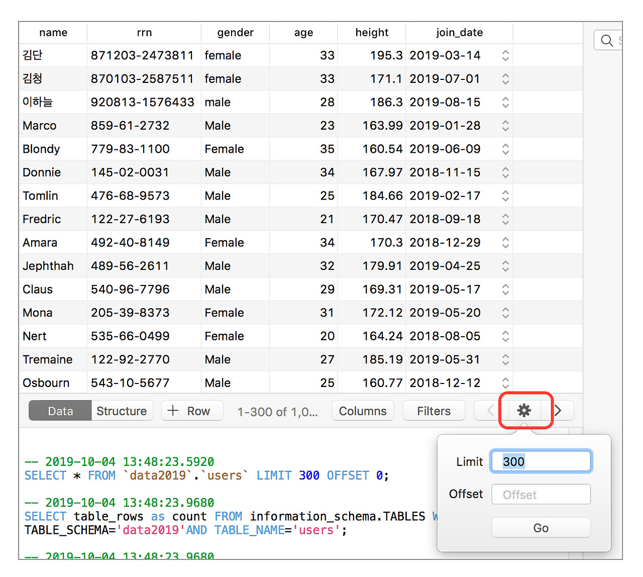 테이블에 데이터 삽입하기 글에서 CSV 파일을 기반으로 데이터를 임포트했던 users 테이블을 기억하실 겁니다. TablePlus 좌측 패널에서 users 테이블을 선택하면, 우측 패널에는 users 테이블의 데이터가 보여집니다. 이때 TablePlus는 users 테이블에 저장되어있는 모든 데이터를 가져오는 것일까요? TablePlus는 기본값으로 테이블에 있는 300개의 행을 선택해서 보여주게 되어있습니다.