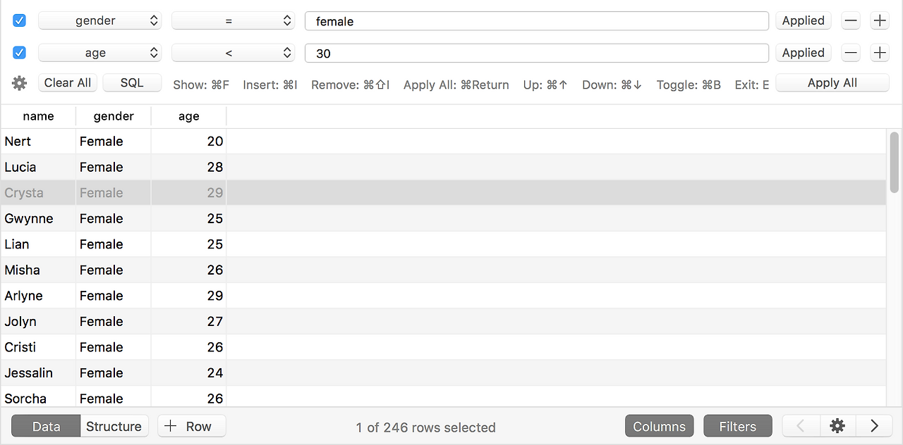 여자 사용자만 나오도록 잘 필터가 적용되었나요? 여자 사용자 필터에 나이 필터도 추가해보도록 합시다. Apply 우측에 있는 + 버튼을 클릭하면, 또 다른 필터가 생기게 됩니다. 새롭게 만들어진 필터를 나이가 30세 미만의 사용자만 선택하도록 설정해봅시다. 열을 age로 만들고, =로 되어있던 조건을 < 로 선택하면 됩니다. 마지막으로, 오른쪽 값에 30을 입력해줍니다. 이제 Apply All 버튼을 눌르면, 성별과 나이 두개의 필터 모두가 적용된 것을 확인할 수 있습니다. 참고로, Apply All 이 아닌 Apply 버튼만 누르면 해당 필터 조건만 적용됩니다 :)