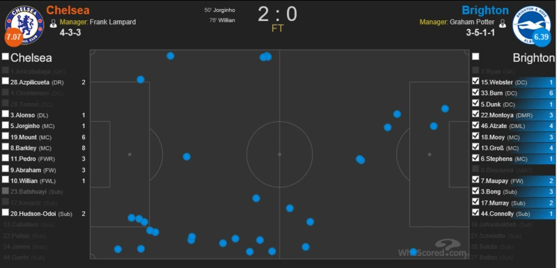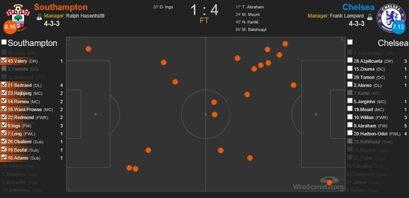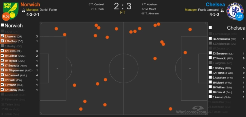 노리치, 울버햄튼이 볼 소유권 잃은 위치 (후스코어드) 브라이튼, 사우샘프턴이 볼 소유권 잃은 위치 (후스코어드) 램파드의 첼시는 포백을 플랜A로 쓰리백을 플랜B로 사용하고 있는데 두 전형 모두 측면에서의 조직적인 압박을 기본 토대로 하고 있다. 램파드가 사용하는 압박의 과정은 다음과 같다. 중앙 미드필더 뿐만 아니라 측면 윙어에게도 전후방을 오가는 움직임을 주문하고 있다(사우샘프턴전 윌리안,오두이 히트맵 참고). 즉 상대의 공격을 측면에서 제어하기 위해 사이드 미드필더와 윙어 그리고 풀백(윙백)이 1,2차에 걸친 압박을 진행한다. 그 과정에서 발생하는 조직적인 압박이 상대의 볼 소유권을 잃게 만드는 효과를 보고 있다. 위 사진은 첼시의 리그 승리 경기에서 상대가 볼소유권을 잃은 위치를 나타낸다. 모두 측면에 많은 점들이 분표해 있는 것을 알 수 있다. 이처럼 램파드는 측면을 봉쇄함에 따라 첼시가 중원을 지배하게 하고 상대가 박스로 볼투입을 하는데 있어서 어려움을 겪게 만들고 있다. 비록 이번 시즌 클린시트가 단 1경기에 불과하지만 램파드가 주입시키고 있는 압박 전술은 시즌이 갈수록 그 완성도가 높아질 것으로 예상된다.