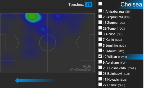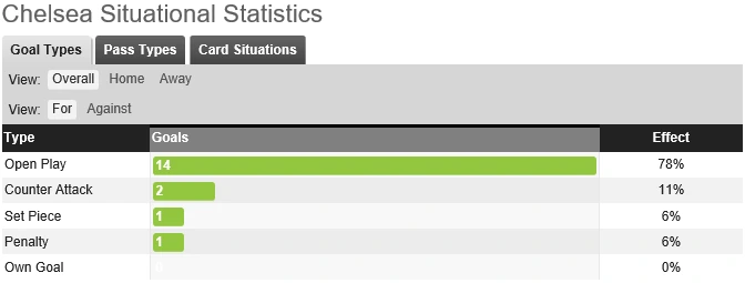 사진 출처 - 후스코어드그 이유는 램파드의 첼시가 뚜렷한 팀컬러를 보유하고 있기 때문이다. 이번 시즌 첼시는 공수 모두에 있어서 확실한 컨셉을 가지고 있다. 이들은 현재 리그에서 18골을 기록하며 최다 득점 3위에 랭크되어 있다. 인상적인 것은 18골 중 무려 14골이 오픈 플레이 상황에서 나왔다는 것이다. 이는 맨시티에 이어 2위에 해당되는 기록이다(후스코어드). 뿐만 아니라 카운터 어택으로의 득점 또한 3골로 리그 1위를 질주하고 있다(EPL 공식 홈페이지). 이와 같이 간결함이 필수적으로 요구되는 오픈플레이와 카운터 어택에서 첼시가 강점을 발휘할 수 있는 것은 공격진의 스피드과 기동력 때문이다. 첼시의 공격진은 2선 자원의 스피드와 기동력을 주무기로 장착하고 원톱의 결정력을 앞세워 상대를 무너뜨리고 있다. 에이브러햄, 마운트, 오도이의 젊음과 윌리안, 페드로의 노련함이 시너지 효과를 불러일으키는 것은 덤이다. 지금과 같은 파괴력을 시즌 중후반까지 유지할수만 있다면 리그 정상급 공격진이라고 불려도 손색없을 만큼 환상적인 모습을 보여주고 있다.