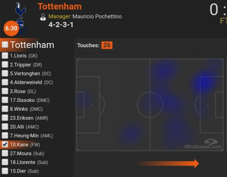 리버풀(18-19 시즌 챔스 결승), 브라이튼(19-20 시즌 리그) 케인 히트맵 (후스코어드) 그런데 아이러니하게도 케인은 부진했던 경기에서도 이전과 같은 움직임을 구사했다. 활동 범위가 전혀 줄어들지 않았다는 말이다. 위 사진은 지난 시즌 리버풀과의 챔피언스리그 결승전과 이번 시즌 브라이튼전 케인의 히트맵이다. 두 경기 모두에서 케인은 좋은 평가를 받지 못했다. 하지만 그는 다른 경기들과 마찬가지로 낮은 위치까지 내려와 플레이했다. 이는 결국 케인이 경기 내에서 행사하는 영향력 자체가 줄어들었다고 해석할 수 있다. 그렇다면 케인의 영향력이 이토록 눈에 띄게 줄어든 이유는 무엇일까?
